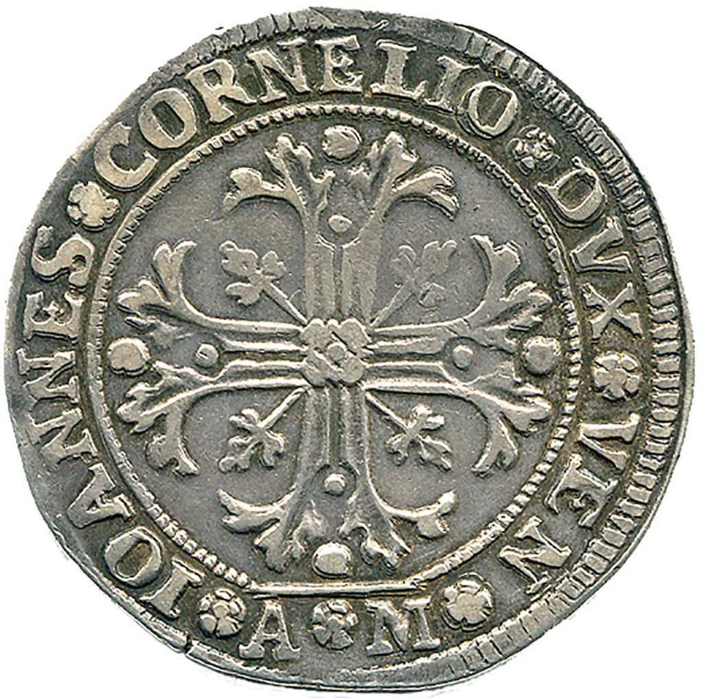 IOANNES fiore CORNELIO fiore DVX fiore VEN (GIOVANNI CORNER DOGE DI VENEZIA)/ fiore A fiore M