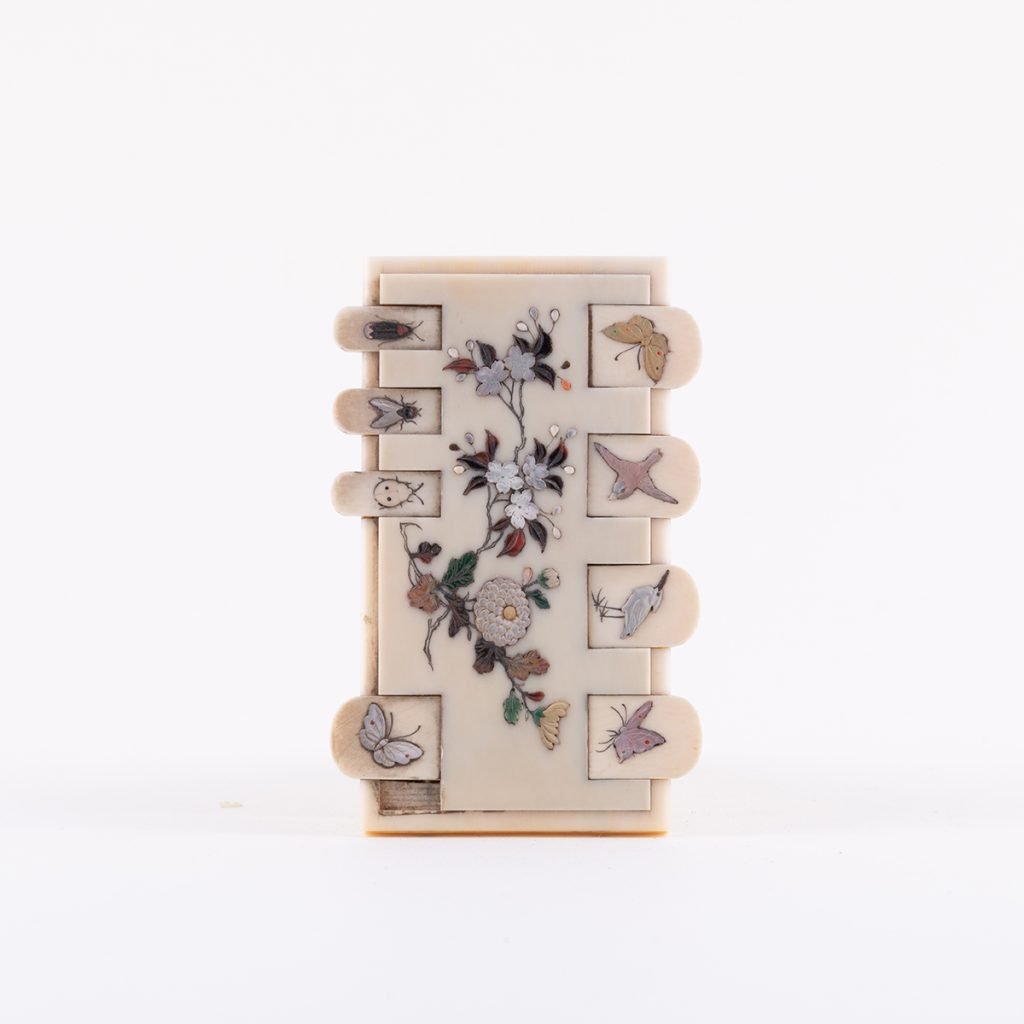 Giocattolo in avorio con inserti di madreperla e smalto. Ad una base rettangolare sono agganciati dei piccoli listelli che possono alzarsi grazie a dei perni.