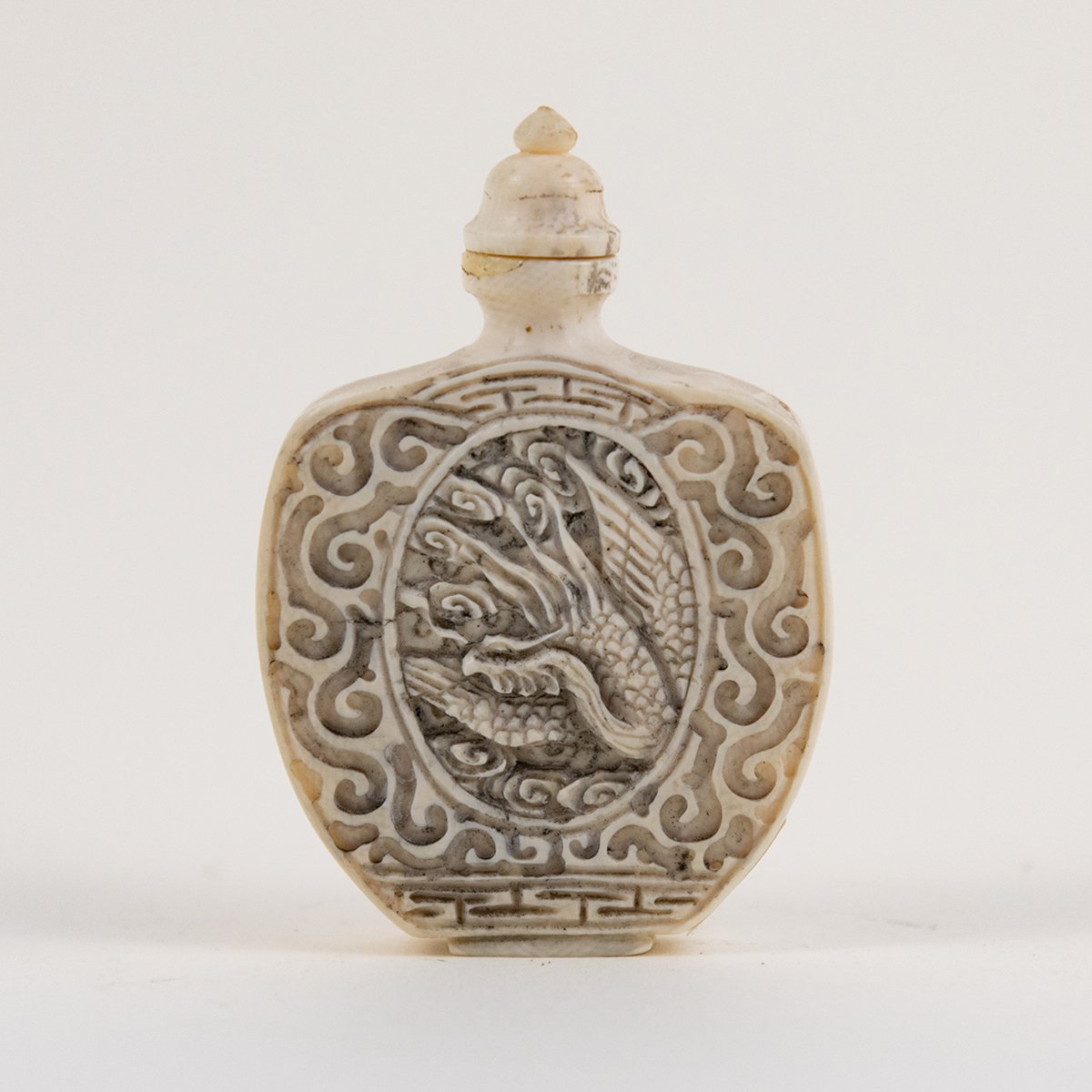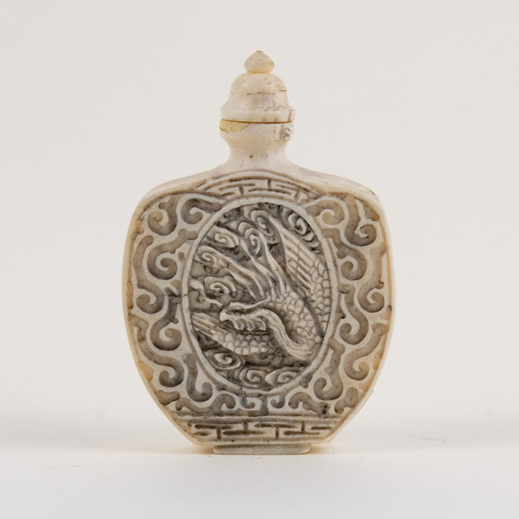 Bottiglietta giapponese per profumo con intagli sulle due facce raffiguranti draghi.