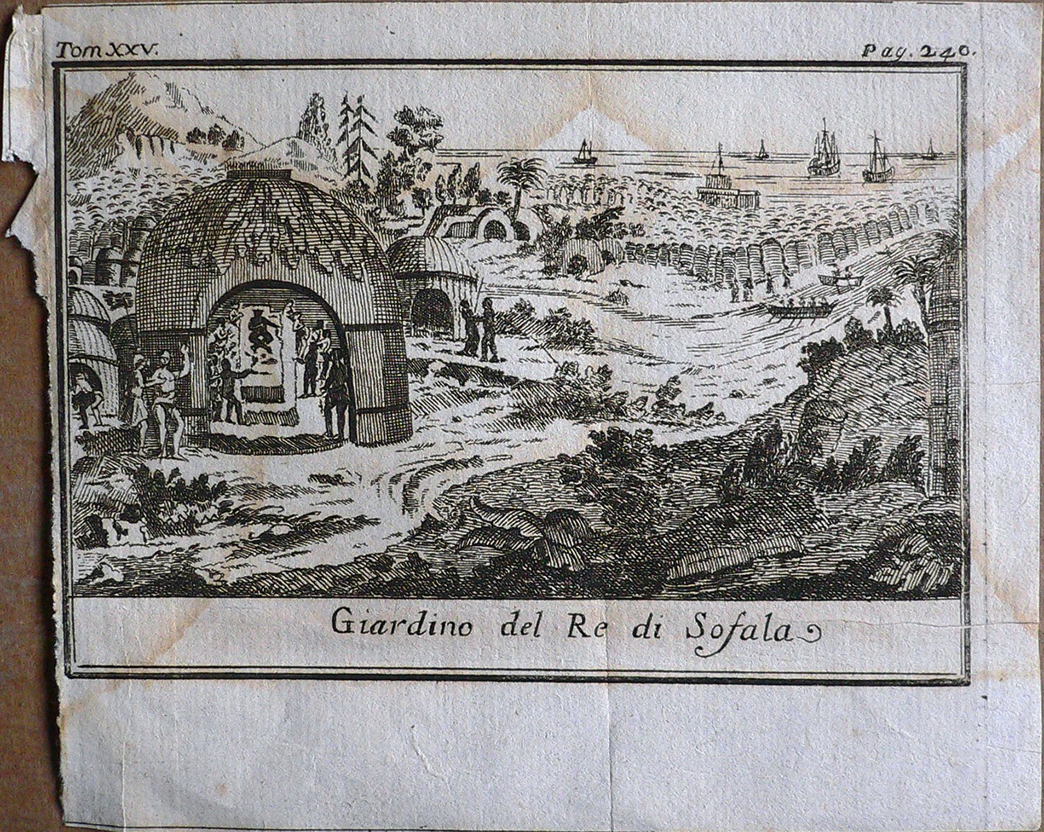 In primo piano sono raffigurate delle capanne a tetto sferico, una di queste presenta al suo interno persone attorno ad un idolo. Sullo sfondo oltre ad una barricata di tronchi la riva sabbiosa e le navi. In alto a destra: Tom. XXV. Pag. 240.