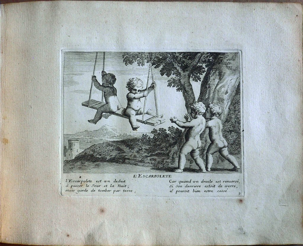 Testo: “L’ Escarpolete est un deduit/ à passer le jour et la nuit;/ mais garde de tomber par terre,/ Car quand un drosle est renuersé,/ si son derriere estoit de verre,/ il pouroit bien estre cassé.” Jacques Stella (Lione, 1596 – Parigi, 1657) è stato un pittore francese. Suo padre era François Stella, pittore e mercante di origine fiamminga Jacques studiò a Lione prima di trascorrere il periodo dal 1616 al 1621 presso la corte di Cosimo II de’ Medici a Firenze, dove lavorò al fianco di Jacques Callot. L’influenza dell’arte fiorentina è visibile in tutta l’opera di Stella. Alla morte di Cosimo de’ Medici Stella si trasferì a Roma dove trascorse il decennio successivo creandosi una certa fama grazie ai suoi dipinti, a piccole incisioni e a piccoli lavori realizzati su pietre dure (onici, lapislazzuli ma anche semplice ardesia); lavorando ad opere commissionategli da Papa Urbano VIII Stella rimase influenzato anche dal classicismo e in particolare dal lavoro di Nicolas Poussin, del quale divenne intimo amico. Claudine Bouzonnet-Stella (Lione, 1636 – 1 October 1697) studiò arte presso suo zio, a Parigi, dal quale apprese le tecniche dell’incisione. Jacques Stella, infatti, aprì un atelier al Louvre e chiese che la sorella mandasse da Lione la sua prole per assisterlo in questo progetto. Claudine, quindi, raggiunse lo zio insieme ai fratellini e alle sorelline. Nel 1657 Jacques Stella morì e la nipote Claudine divenne la direttrice dell’atelier, ottenendo dal re l’esclusiva sulla riproduzione dei cliché dello zio.Claudine successivamente produsse anche delle incisioni originali, come la raccolta intitolata ‘Les Jeux et Plaisirs de l’Enfance‘. Gli storici dell’arte sono comunque propensi a credere che le incisioni firmate dallo zio fossero in realtà opera della giovane Claudine.