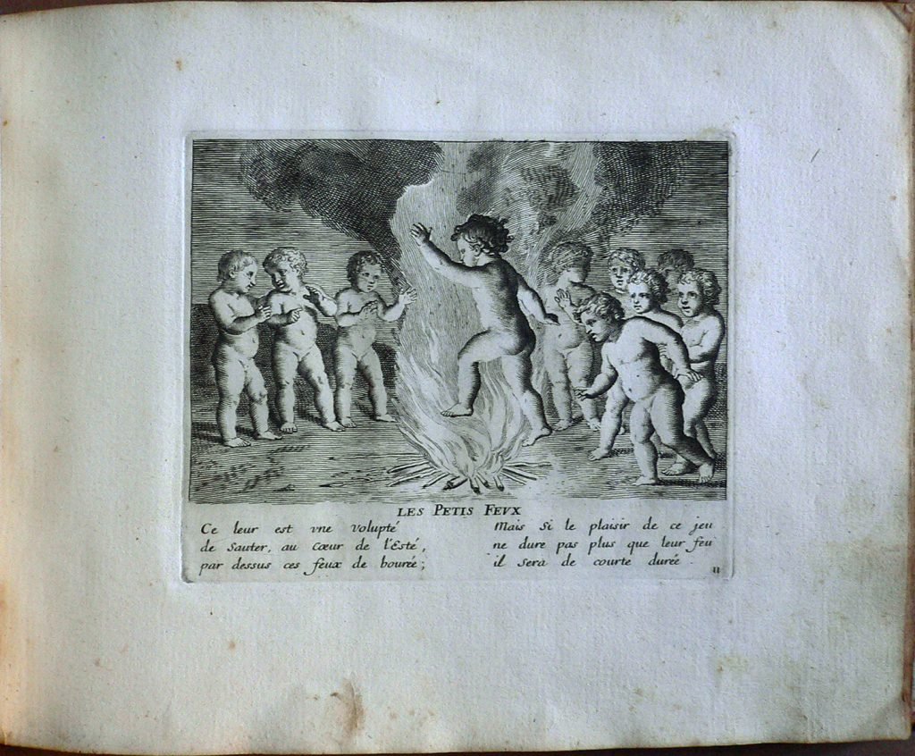 Testo: “Ce leur est une volupté/ de sauter, au Coeur de l’ Esté,/ par dessus ces feux de bourée;/ Mais si le plaisir de ce jeu/ ne dure pas plus que leur feu/ il sera de courte durée.” Jacques Stella (Lione, 1596 – Parigi, 1657) è stato un pittore francese. Suo padre era François Stella, pittore e mercante di origine fiamminga Jacques studiò a Lione prima di trascorrere il periodo dal 1616 al 1621 presso la corte di Cosimo II de’ Medici a Firenze, dove lavorò al fianco di Jacques Callot. L’influenza dell’arte fiorentina è visibile in tutta l’opera di Stella. Alla morte di Cosimo de’ Medici Stella si trasferì a Roma dove trascorse il decennio successivo creandosi una certa fama grazie ai suoi dipinti, a piccole incisioni e a piccoli lavori realizzati su pietre dure (onici, lapislazzuli ma anche semplice ardesia); lavorando ad opere commissionategli da Papa Urbano VIII Stella rimase influenzato anche dal classicismo e in particolare dal lavoro di Nicolas Poussin, del quale divenne intimo amico. Claudine Bouzonnet-Stella (Lione, 1636 – 1 October 1697) studiò arte presso suo zio, a Parigi, dal quale apprese le tecniche dell’incisione. Jacques Stella, infatti, aprì un atelier al Louvre e chiese che la sorella mandasse da Lione la sua prole per assisterlo in questo progetto. Claudine, quindi, raggiunse lo zio insieme ai fratellini e alle sorelline. Nel 1657 Jacques Stella morì e la nipote Claudine divenne la direttrice dell’atelier, ottenendo dal re l’esclusiva sulla riproduzione dei cliché dello zio.Claudine successivamente produsse anche delle incisioni originali, come la raccolta intitolata ‘Les Jeux et Plaisirs de l’Enfance‘. Gli storici dell’arte sono comunque propensi a credere che le incisioni firmate dallo zio fossero in realtà opera della giovane Claudine.