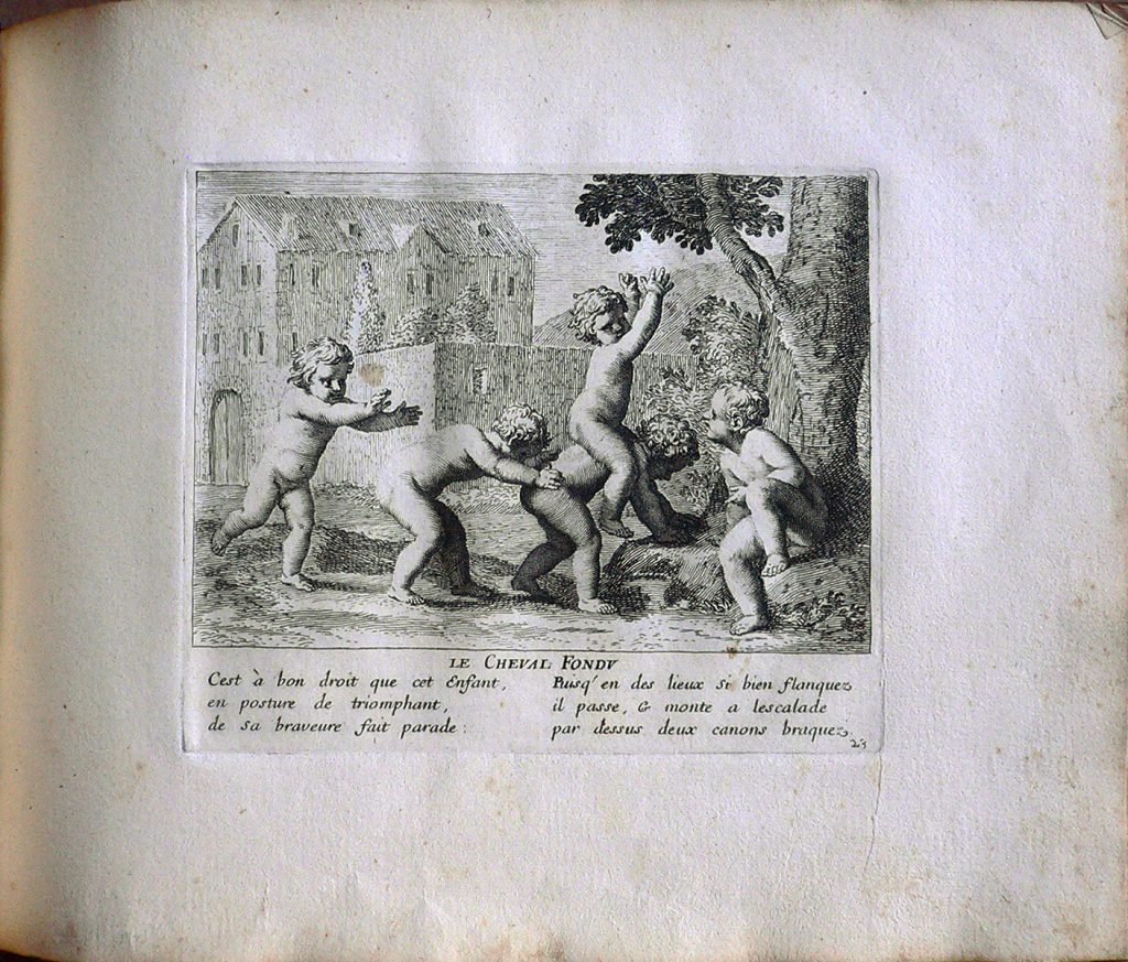 Testo: “Cest à bon droit que cet Enfant/ en posture de triomphant,/ de sa braveure fait parade:/ Puisq’en des lieux si bien flanquez/ il passe, Et monte a lescalade/ par dessus deux canons braquez.” Jacques Stella (Lione, 1596 – Parigi, 1657) è stato un pittore francese. Suo padre era François Stella, pittore e mercante di origine fiamminga Jacques studiò a Lione prima di trascorrere il periodo dal 1616 al 1621 presso la corte di Cosimo II de’ Medici a Firenze, dove lavorò al fianco di Jacques Callot. L’influenza dell’arte fiorentina è visibile in tutta l’opera di Stella. Alla morte di Cosimo de’ Medici Stella si trasferì a Roma dove trascorse il decennio successivo creandosi una certa fama grazie ai suoi dipinti, a piccole incisioni e a piccoli lavori realizzati su pietre dure (onici, lapislazzuli ma anche semplice ardesia); lavorando ad opere commissionategli da Papa Urbano VIII Stella rimase influenzato anche dal classicismo e in particolare dal lavoro di Nicolas Poussin, del quale divenne intimo amico. Claudine Bouzonnet-Stella (Lione, 1636 – 1 October 1697) studiò arte presso suo zio, a Parigi, dal quale apprese le tecniche dell’incisione. Jacques Stella, infatti, aprì un atelier al Louvre e chiese che la sorella mandasse da Lione la sua prole per assisterlo in questo progetto. Claudine, quindi, raggiunse lo zio insieme ai fratellini e alle sorelline. Nel 1657 Jacques Stella morì e la nipote Claudine divenne la direttrice dell’atelier, ottenendo dal re l’esclusiva sulla riproduzione dei cliché dello zio.Claudine successivamente produsse anche delle incisioni originali, come la raccolta intitolata ‘Les Jeux et Plaisirs de l’Enfance‘. Gli storici dell’arte sono comunque propensi a credere che le incisioni firmate dallo zio fossero in realtà opera della giovane Claudine.