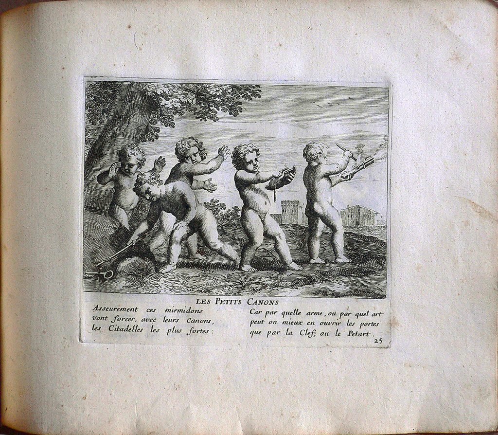Testo: “Assuerement ces mirmidons/ vont forcer, avec leurs Canons,/ les Citadelles les plus fortes:/ Car par quelle arme, ou par quel art/ peut on mieux en ouvrir les portes/ que par la Clef; ou le Petart.” Jacques Stella (Lione, 1596 – Parigi, 1657) è stato un pittore francese. Suo padre era François Stella, pittore e mercante di origine fiamminga Jacques studiò a Lione prima di trascorrere il periodo dal 1616 al 1621 presso la corte di Cosimo II de’ Medici a Firenze, dove lavorò al fianco di Jacques Callot. L’influenza dell’arte fiorentina è visibile in tutta l’opera di Stella. Alla morte di Cosimo de’ Medici Stella si trasferì a Roma dove trascorse il decennio successivo creandosi una certa fama grazie ai suoi dipinti, a piccole incisioni e a piccoli lavori realizzati su pietre dure (onici, lapislazzuli ma anche semplice ardesia); lavorando ad opere commissionategli da Papa Urbano VIII Stella rimase influenzato anche dal classicismo e in particolare dal lavoro di Nicolas Poussin, del quale divenne intimo amico. Claudine Bouzonnet-Stella (Lione, 1636 – 1 October 1697) studiò arte presso suo zio, a Parigi, dal quale apprese le tecniche dell’incisione. Jacques Stella, infatti, aprì un atelier al Louvre e chiese che la sorella mandasse da Lione la sua prole per assisterlo in questo progetto. Claudine, quindi, raggiunse lo zio insieme ai fratellini e alle sorelline. Nel 1657 Jacques Stella morì e la nipote Claudine divenne la direttrice dell’atelier, ottenendo dal re l’esclusiva sulla riproduzione dei cliché dello zio.Claudine successivamente produsse anche delle incisioni originali, come la raccolta intitolata ‘Les Jeux et Plaisirs de l’Enfance‘. Gli storici dell’arte sono comunque propensi a credere che le incisioni firmate dallo zio fossero in realtà opera della giovane Claudine.