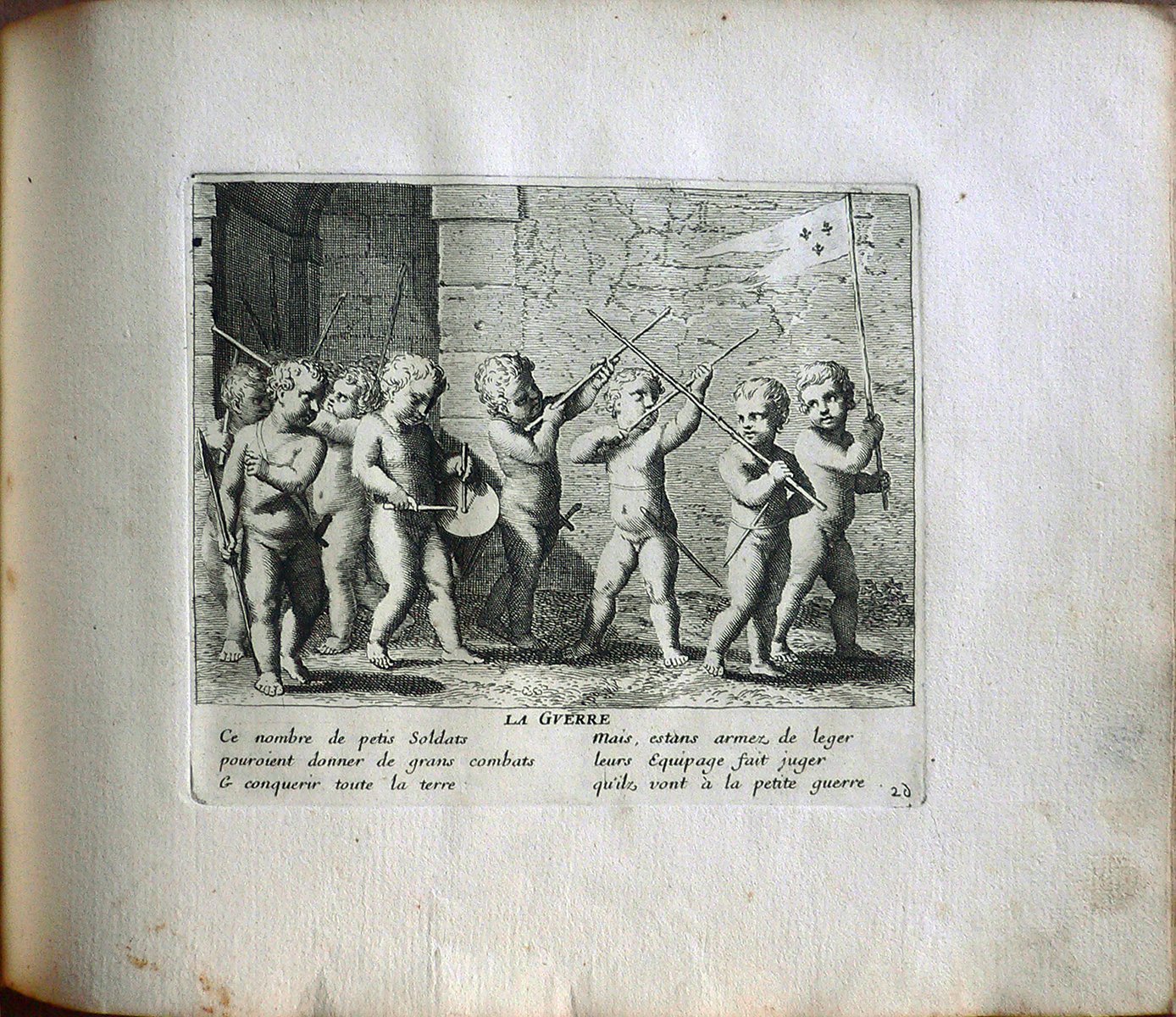 Testo: “Ce nombre de petis Soldats/ pouroient donner de grans combats/ Et conquerir toute la terre:/ Mais, estans armez de leger/ leurs Equipage fait juger/ qu’ilz vont à la petite guerre.” Jacques Stella (Lione, 1596 – Parigi, 1657) è stato un pittore francese. Suo padre era François Stella, pittore e mercante di origine fiamminga Jacques studiò a Lione prima di trascorrere il periodo dal 1616 al 1621 presso la corte di Cosimo II de’ Medici a Firenze, dove lavorò al fianco di Jacques Callot. L’influenza dell’arte fiorentina è visibile in tutta l’opera di Stella. Alla morte di Cosimo de’ Medici Stella si trasferì a Roma dove trascorse il decennio successivo creandosi una certa fama grazie ai suoi dipinti, a piccole incisioni e a piccoli lavori realizzati su pietre dure (onici, lapislazzuli ma anche semplice ardesia); lavorando ad opere commissionategli da Papa Urbano VIII Stella rimase influenzato anche dal classicismo e in particolare dal lavoro di Nicolas Poussin, del quale divenne intimo amico. Claudine Bouzonnet-Stella (Lione, 1636 – 1 October 1697) studiò arte presso suo zio, a Parigi, dal quale apprese le tecniche dell’incisione. Jacques Stella, infatti, aprì un atelier al Louvre e chiese che la sorella mandasse da Lione la sua prole per assisterlo in questo progetto. Claudine, quindi, raggiunse lo zio insieme ai fratellini e alle sorelline. Nel 1657 Jacques Stella morì e la nipote Claudine divenne la direttrice dell’atelier, ottenendo dal re l’esclusiva sulla riproduzione dei cliché dello zio.Claudine successivamente produsse anche delle incisioni originali, come la raccolta intitolata ‘Les Jeux et Plaisirs de l’Enfance‘. Gli storici dell’arte sono comunque propensi a credere che le incisioni firmate dallo zio fossero in realtà opera della giovane Claudine.