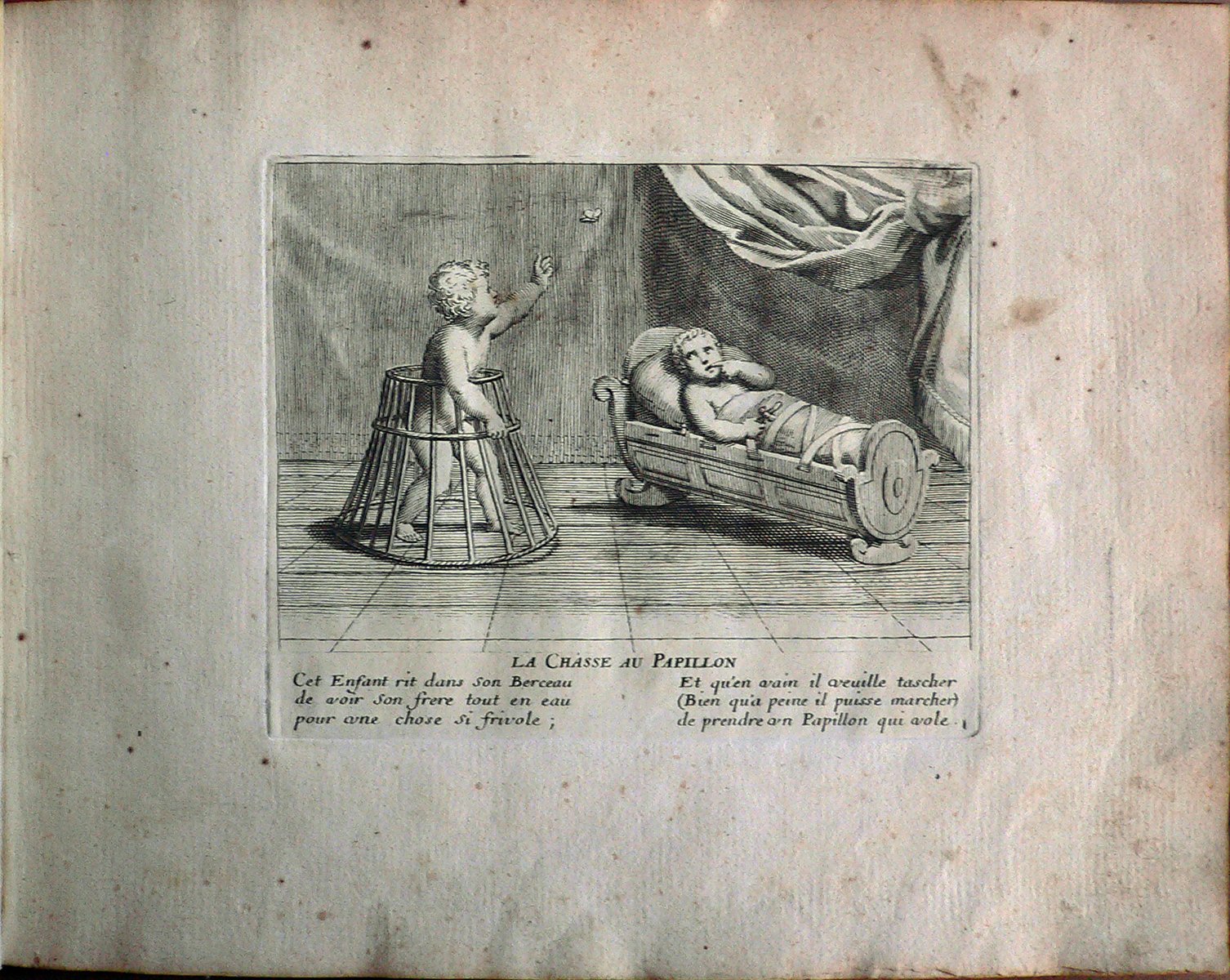 Un bambino nel girello cerca di catturare una farfalla mentre il fratellino lo osserva dalla culla. Presenza di numerazione della stampa: 1. La stampa appartiene ad una raccolta di 52 incisioni rilegate sul lato sinistro.