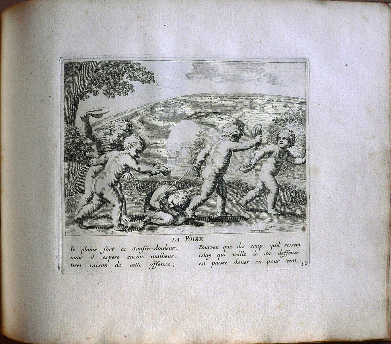 Testo: “Ie plains fort ce soufre-douleur,/ mais il espere enson malheur/ tirer raison de cette offense;/ Pourveu que des coups qu’il ressent/ celay qui veille à sa deffense/ en puisse doner un pour cent.” Jacques Stella (Lione, 1596 – Parigi, 1657) è stato un pittore francese. Suo padre era François Stella, pittore e mercante di origine fiamminga Jacques studiò a Lione prima di trascorrere il periodo dal 1616 al 1621 presso la corte di Cosimo II de’ Medici a Firenze, dove lavorò al fianco di Jacques Callot. L’influenza dell’arte fiorentina è visibile in tutta l’opera di Stella. Alla morte di Cosimo de’ Medici Stella si trasferì a Roma dove trascorse il decennio successivo creandosi una certa fama grazie ai suoi dipinti, a piccole incisioni e a piccoli lavori realizzati su pietre dure (onici, lapislazzuli ma anche semplice ardesia); lavorando ad opere commissionategli da Papa Urbano VIII Stella rimase influenzato anche dal classicismo e in particolare dal lavoro di Nicolas Poussin, del quale divenne intimo amico. Claudine Bouzonnet-Stella (Lione, 1636 – 1 October 1697) studiò arte presso suo zio, a Parigi, dal quale apprese le tecniche dell’incisione. Jacques Stella, infatti, aprì un atelier al Louvre e chiese che la sorella mandasse da Lione la sua prole per assisterlo in questo progetto. Claudine, quindi, raggiunse lo zio insieme ai fratellini e alle sorelline. Nel 1657 Jacques Stella morì e la nipote Claudine divenne la direttrice dell’atelier, ottenendo dal re l’esclusiva sulla riproduzione dei cliché dello zio.Claudine successivamente produsse anche delle incisioni originali, come la raccolta intitolata ‘Les Jeux et Plaisirs de l’Enfance‘. Gli storici dell’arte sono comunque propensi a credere che le incisioni firmate dallo zio fossero in realtà opera della giovane Claudine.