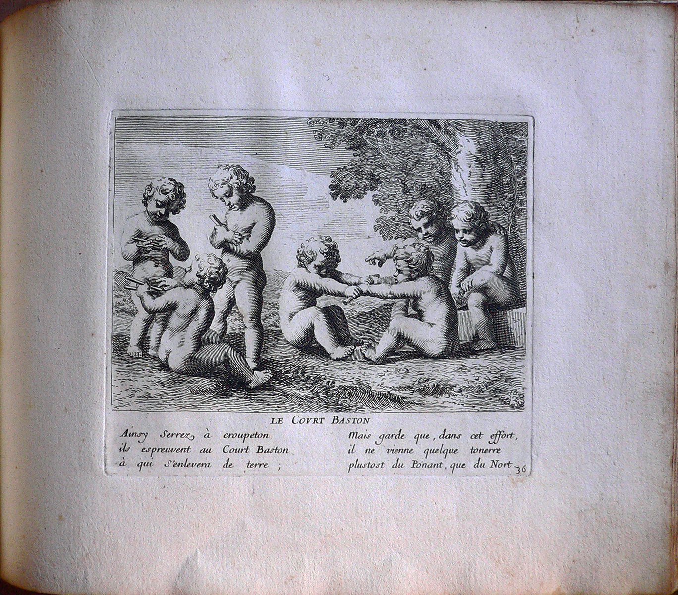 In un prato un gruppetto di bambini gioca con dei bastoni: due in coppia fanno a chi vince in forza, altri tre chiacchierano, mentre due assistono alla sfida, seduti. Presenza di filigrana. Presenza di numerazione della stampa: 36. La stampa appartiene ad una raccolta di 52 incisioni rilegate sul lato sinistro.