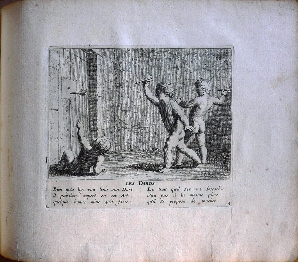 Testo: “Bien qu’a lay voir tenir son Dart/ il paraisse expert en cet Art,/ quelque bonne mine qu’il fasse;/ Le trait qu’il se’n va descocher/ n’ira pas à la mesme place/ qu’il se propose de toucher.” Jacques Stella (Lione, 1596 – Parigi, 1657) è stato un pittore francese. Suo padre era François Stella, pittore e mercante di origine fiamminga Jacques studiò a Lione prima di trascorrere il periodo dal 1616 al 1621 presso la corte di Cosimo II de’ Medici a Firenze, dove lavorò al fianco di Jacques Callot. L’influenza dell’arte fiorentina è visibile in tutta l’opera di Stella. Alla morte di Cosimo de’ Medici Stella si trasferì a Roma dove trascorse il decennio successivo creandosi una certa fama grazie ai suoi dipinti, a piccole incisioni e a piccoli lavori realizzati su pietre dure (onici, lapislazzuli ma anche semplice ardesia); lavorando ad opere commissionategli da Papa Urbano VIII Stella rimase influenzato anche dal classicismo e in particolare dal lavoro di Nicolas Poussin, del quale divenne intimo amico. Claudine Bouzonnet-Stella (Lione, 1636 – 1 October 1697) studiò arte presso suo zio, a Parigi, dal quale apprese le tecniche dell’incisione. Jacques Stella, infatti, aprì un atelier al Louvre e chiese che la sorella mandasse da Lione la sua prole per assisterlo in questo progetto. Claudine, quindi, raggiunse lo zio insieme ai fratellini e alle sorelline. Nel 1657 Jacques Stella morì e la nipote Claudine divenne la direttrice dell’atelier, ottenendo dal re l’esclusiva sulla riproduzione dei cliché dello zio.Claudine successivamente produsse anche delle incisioni originali, come la raccolta intitolata ‘Les Jeux et Plaisirs de l’Enfance‘. Gli storici dell’arte sono comunque propensi a credere che le incisioni firmate dallo zio fossero in realtà opera della giovane Claudine.