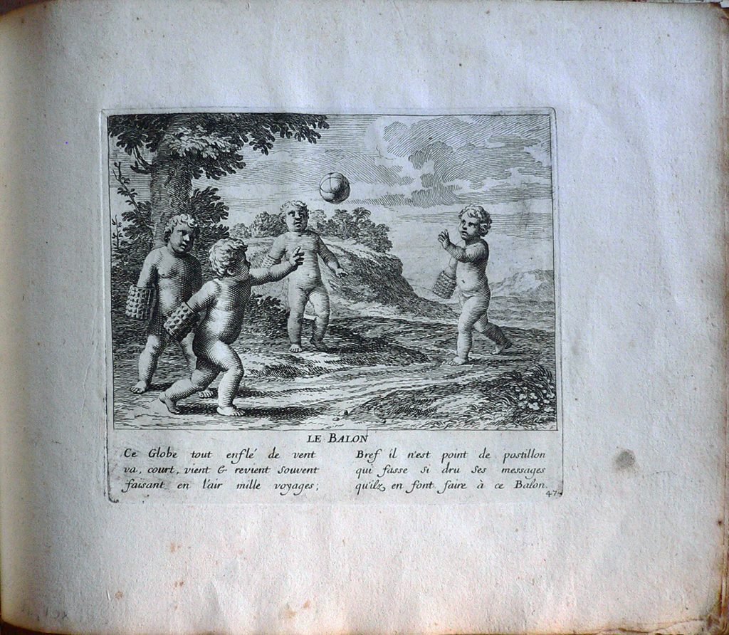 Testo: “Ce Globe tout enflé de vent/ va, court, vient et revient souvent/ faisant en l’air mille voyage;/ Bref il n’est point de postillon/ qui fasse si dru ses messages/ qu’ilz en font faire à ce Balon.” Jacques Stella (Lione, 1596 – Parigi, 1657) è stato un pittore francese. Suo padre era François Stella, pittore e mercante di origine fiamminga Jacques studiò a Lione prima di trascorrere il periodo dal 1616 al 1621 presso la corte di Cosimo II de’ Medici a Firenze, dove lavorò al fianco di Jacques Callot. L’influenza dell’arte fiorentina è visibile in tutta l’opera di Stella. Alla morte di Cosimo de’ Medici Stella si trasferì a Roma dove trascorse il decennio successivo creandosi una certa fama grazie ai suoi dipinti, a piccole incisioni e a piccoli lavori realizzati su pietre dure (onici, lapislazzuli ma anche semplice ardesia); lavorando ad opere commissionategli da Papa Urbano VIII Stella rimase influenzato anche dal classicismo e in particolare dal lavoro di Nicolas Poussin, del quale divenne intimo amico. Claudine Bouzonnet-Stella (Lione, 1636 – 1 October 1697) studiò arte presso suo zio, a Parigi, dal quale apprese le tecniche dell’incisione. Jacques Stella, infatti, aprì un atelier al Louvre e chiese che la sorella mandasse da Lione la sua prole per assisterlo in questo progetto. Claudine, quindi, raggiunse lo zio insieme ai fratellini e alle sorelline. Nel 1657 Jacques Stella morì e la nipote Claudine divenne la direttrice dell’atelier, ottenendo dal re l’esclusiva sulla riproduzione dei cliché dello zio.Claudine successivamente produsse anche delle incisioni originali, come la raccolta intitolata ‘Les Jeux et Plaisirs de l’Enfance‘. Gli storici dell’arte sono comunque propensi a credere che le incisioni firmate dallo zio fossero in realtà opera della giovane Claudine.