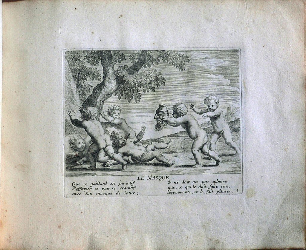 Testo: “Que ce gaillard est jnventif/ d’effrayer ce pauvre craintif/ avec son masque de Satire;/ Et ne doit on pas admirer/ que, ce qui le doit faire rire,/ l’ espouvante, et le fait pleurer.” Jacques Stella (Lione, 1596 – Parigi, 1657) è stato un pittore francese. Suo padre era François Stella, pittore e mercante di origine fiamminga Jacques studiò a Lione prima di trascorrere il periodo dal 1616 al 1621 presso la corte di Cosimo II de’ Medici a Firenze, dove lavorò al fianco di Jacques Callot. L’influenza dell’arte fiorentina è visibile in tutta l’opera di Stella. Alla morte di Cosimo de’ Medici Stella si trasferì a Roma dove trascorse il decennio successivo creandosi una certa fama grazie ai suoi dipinti, a piccole incisioni e a piccoli lavori realizzati su pietre dure (onici, lapislazzuli ma anche semplice ardesia); lavorando ad opere commissionategli da Papa Urbano VIII Stella rimase influenzato anche dal classicismo e in particolare dal lavoro di Nicolas Poussin, del quale divenne intimo amico. Claudine Bouzonnet-Stella (Lione, 1636 – 1 October 1697) studiò arte presso suo zio, a Parigi, dal quale apprese le tecniche dell’incisione. Jacques Stella, infatti, aprì un atelier al Louvre e chiese che la sorella mandasse da Lione la sua prole per assisterlo in questo progetto. Claudine, quindi, raggiunse lo zio insieme ai fratellini e alle sorelline. Nel 1657 Jacques Stella morì e la nipote Claudine divenne la direttrice dell’atelier, ottenendo dal re l’esclusiva sulla riproduzione dei cliché dello zio.Claudine successivamente produsse anche delle incisioni originali, come la raccolta intitolata ‘Les Jeux et Plaisirs de l’Enfance‘. Gli storici dell’arte sono comunque propensi a credere che le incisioni firmate dallo zio fossero in realtà opera della giovane Claudine.