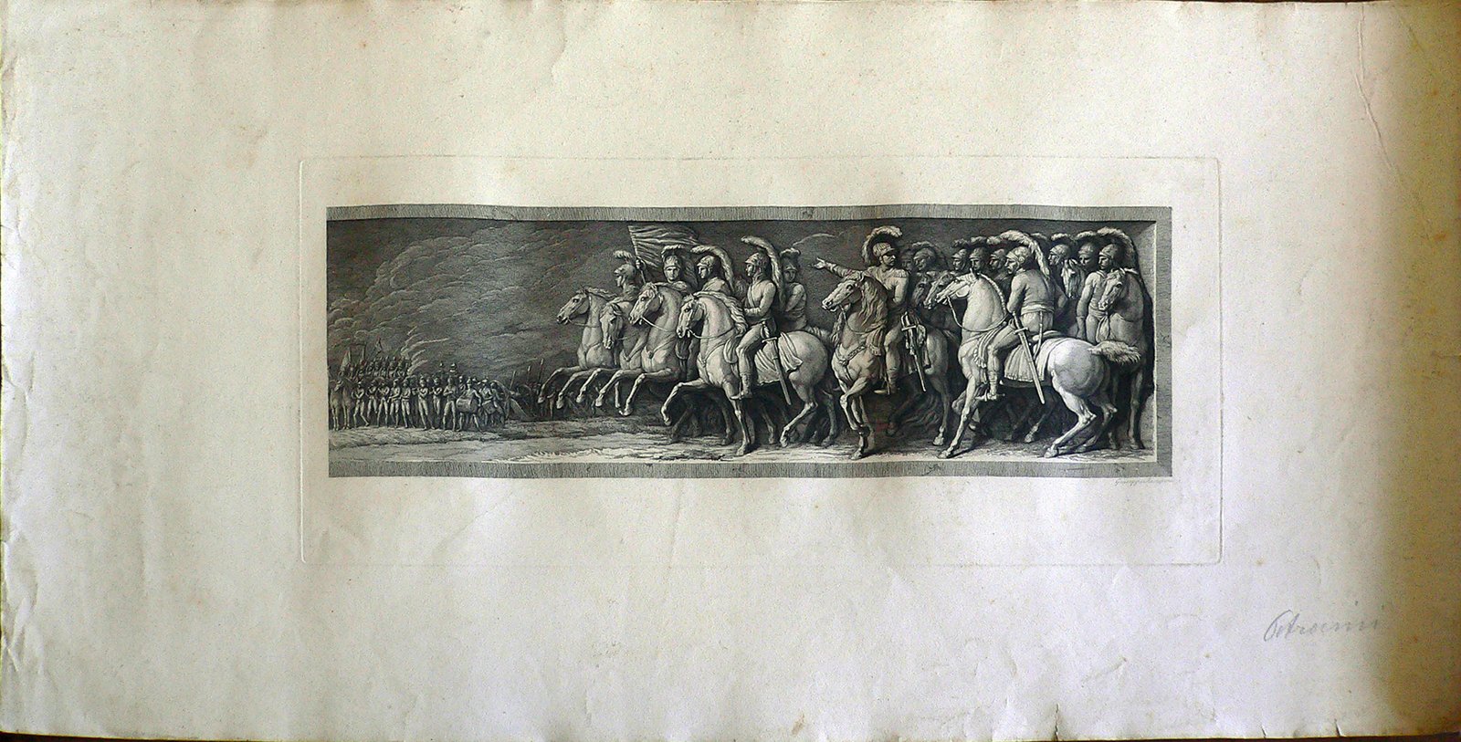 In primo piano un ufficiale impartisce le ultime direttive ai cavalieri. Davanti a lui cinque uomini a cavallo con lo stendardo. Sulla sinistra la banda militare e i fanti stanti con aste e due cannoni. La scena è incorniciata su tre lati da una banda. Sul retro: timbro Piero Malossi; in basso a destra: “Petrocini”; in alto a destra: “22” a matita sottolineato.