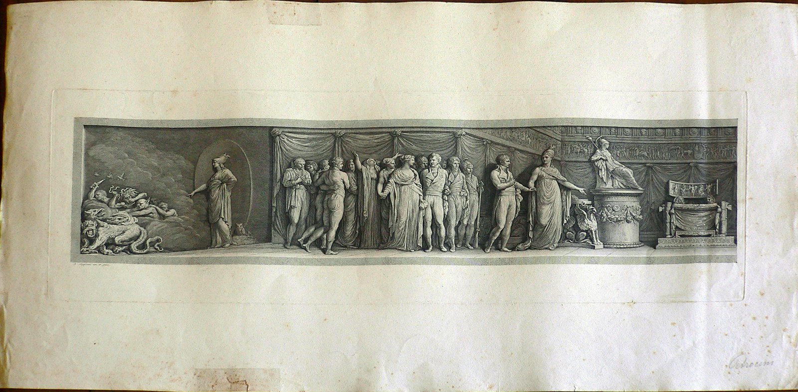 Sequenza. Una folla di uomini e donne, al’interno di un palazzo, stanno assistendo ad una scena: una donna con elmo indica a Napoleone il trono. All’esterno la stessa, accompagnata da una civetta, scaccia dei demoni. In basso a destra: “Petrocini”; in alto a destra: “32”.