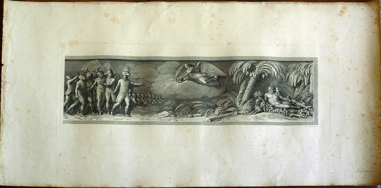 Napoleone in primo piano si rivolge ai compagni alle sue spalle. Al centro un angelo gli consegna una palma e una corona d’alloro. Sulla destra scena mitologica: divinità con coppia piena di fiori e frutta,undici putti, coccodrillo e Sfinge Sul retro: timbro Piero Malossi; in basso a destra: “Petrocini”; in alto a destra:”11″.
