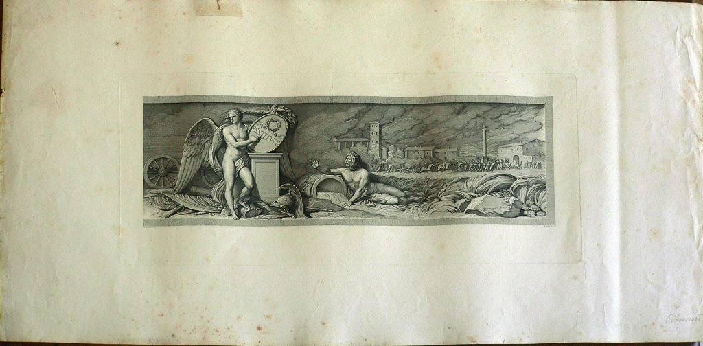 Sulla sinistra personaggio alato scrive su uno scudo appoggiato su un’ara: “RESTITVIT”. Sulla sinistra foglia di palma e corona d’alloro. Al centro personaggio anziano gli tende la mano destra appoggiata su un vaso rovesciato da cui esce acqua. Dietro battaglia. In basso a destra: “Petrocini”; in alto a destra:”23″.