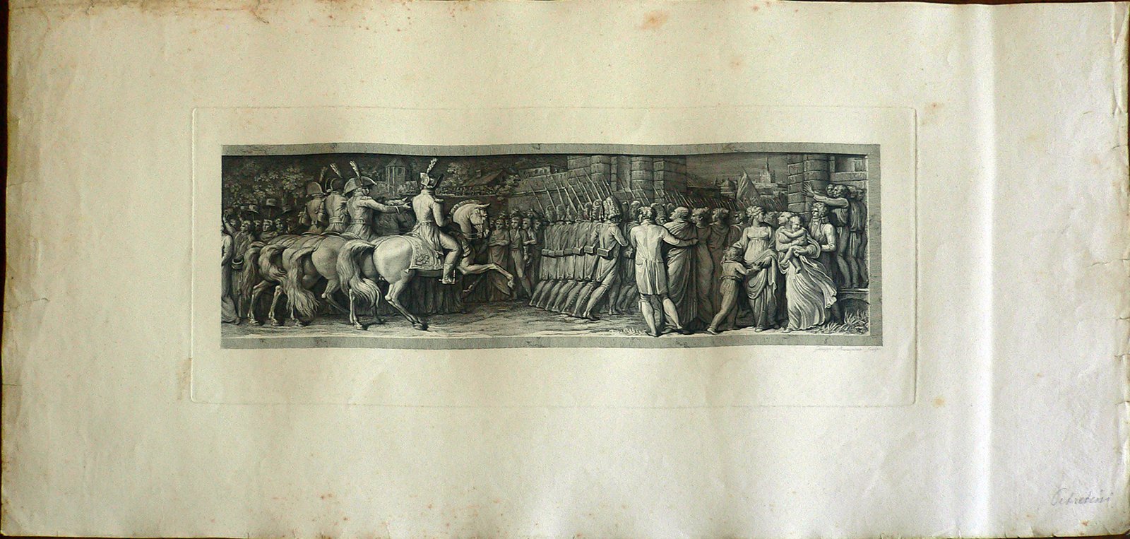Le incisioni “I Fasti di Napoleone” narrano le gesta eroiche condotte da Napoleone in pace e in guerra nel periodo compreso tra la prima campagna d’Italia (1796) e la vittoria di Friedland (1807), eredi del ciclo già collocato nella Sala delle Cariatidi del Palazzo Reale di Milano, distrutto nel 1943 durante i bombardamenti della seconda guerra mondiale. Si trattava di un fregio costituito da 39 dipinti a tempera su tela ad imitazione del bassorilievo antico, realizzato da Andrea Appiani tra il 1800-1801 circa e il 1807. Dopo la prima edizione del 1826 le stampe conobbero una notevole diffusione. I fratelli Didot di Parigi, proprietari delle lastre nel 1860, ne promossero un’edizione rilegata ad album corredata da testi esplicativi e commento storico dedicata a Napoleone III. Scopo dell’impresa era quello di legittimare il potere di Napoleone III attraverso il rimando all’Impero napoleonico. Gli esemplari conservati nella Collezione Pietro Malossi sono formati da 31 incisioni.
