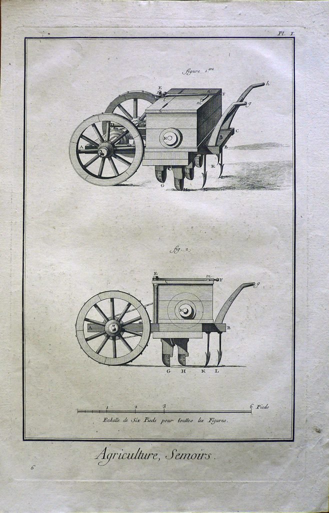 In una cornice rettangolare, è rappresentata la stessa seminatrice riprodotta attraverso due viste: in alto assonometria, in basso prospetto laterale. L’immagine è completata da scala metrica e ogni figura è corredata da lettere e indicate da:”figure. 1.ere” e fig. 2.”. E’ presente numerazione della stampa: Pl.I-6. Sul retro, in matita, nell’angolo in alto a sx: 117/12. Filigrana: una figura.