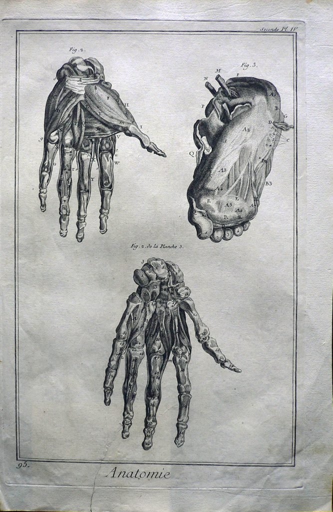 E’ rappresentato lo scheletro della mano con i relativi muscoli e il piede visto dal basso. Ogni parte è corredata da lettere e numeri ed ogni figura è indicata con:”fig.2.”, “fig.2. de la Planche 5.” e “fig.3.” E’ presente numerazione della stampa: Seconde Pl.IV.-95. Filigrana: lettere maiuscole. Sul retro, in matita: timbro Piero Malossi;in mat.:”112 9 ANATOMIA.”