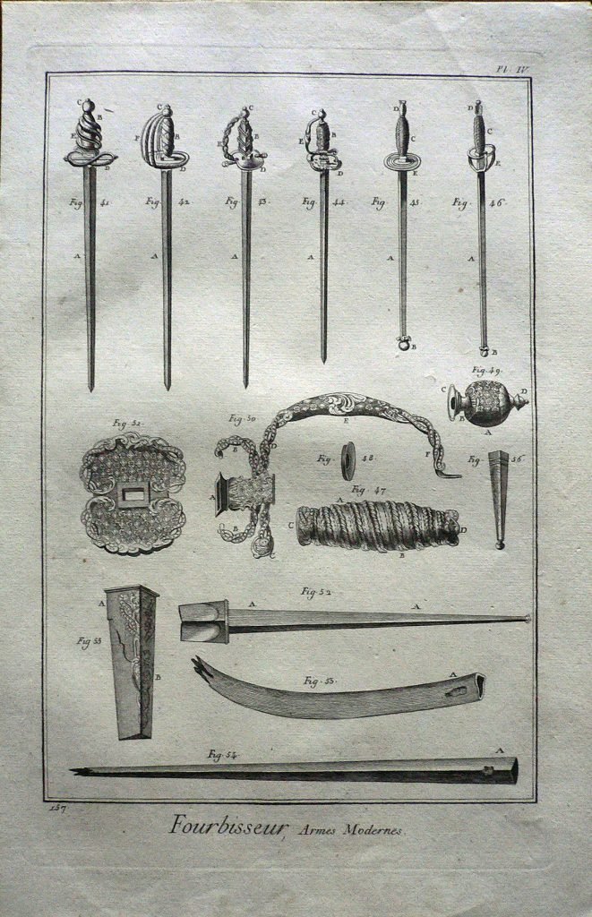 Sono rappresentate varie tipologie di spade e particolari dell’elsa. Ogni figura è connotata da:”fig.”; ogni parte è contraddistinta da lettere. Filigrana: figura umana. E’ presente numerazione della stampa: Pl.IV.-157. Sul retro, a matita: 59/12 e 782