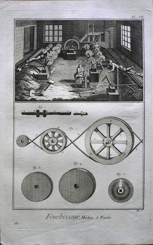 In alto scena d’interno: degli uomini stanno affilando le lame. Sotto sono rappresentate le mole. Ogni figura è connotata da:”fig.”; ogni parte è contraddistinta da lettere. Filigrana: figura umana. E’ presente numerazione della stampa: Pl.VII.-160. Sul retro, a matita: 96/12