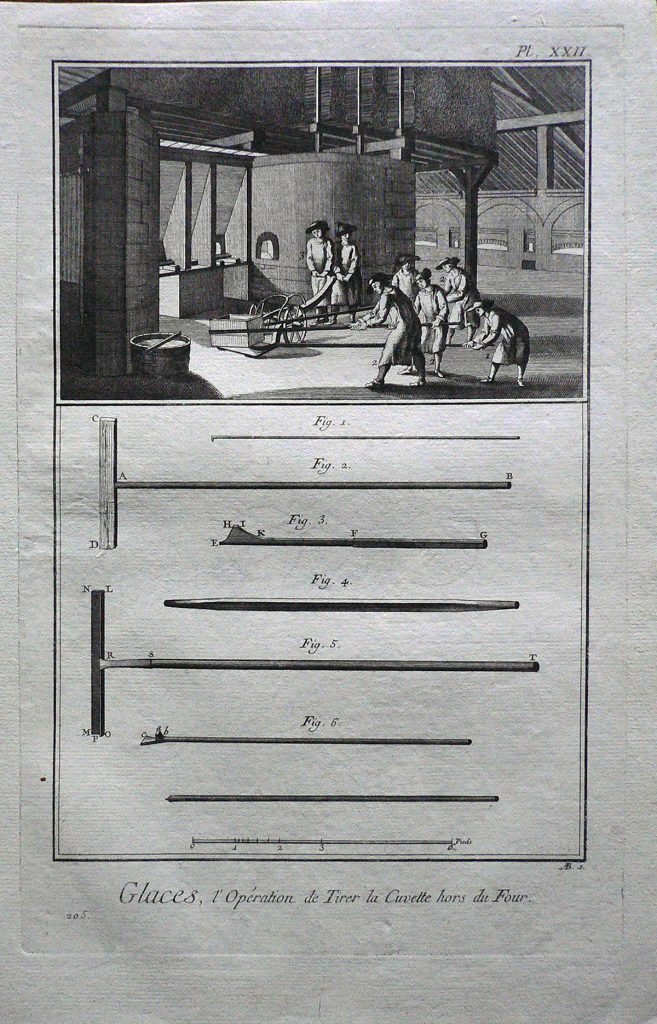 In alto scena d’interno: degli uomini stanno prelevando dal forno un contenitore di legno. Sotto sono rappresentati vari strumenti del mestiere. Ogni figura è connotata da:”fig.”; ogni parte è contraddistinta da numeri e lettere. Filigrana: 3 lune. E’ presente numerazione della stampa: Pl.XXII.-205. e scala metrica. Sul retro, a matita: 280/12