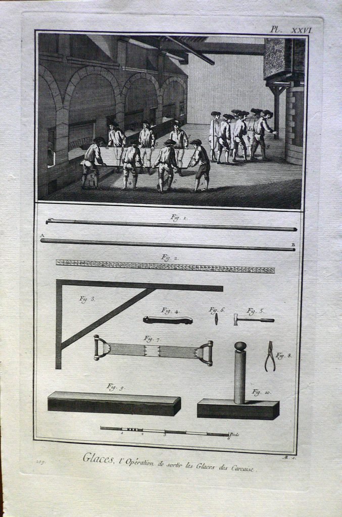 In alto scena d’interno: degli uomini stanno estraendo dal forno una lastra. Sotto sono rappresentati vari strumenti del mestiere. Ogni figura è connotata da:”fig.”; ogni parte è contraddistinta da numeri e lettere. Filigrana: lettere C S. E’ presente numerazione della stampa: Pl.XXVI.-209. e scala metrica. Sul retro, a matita: 275/12