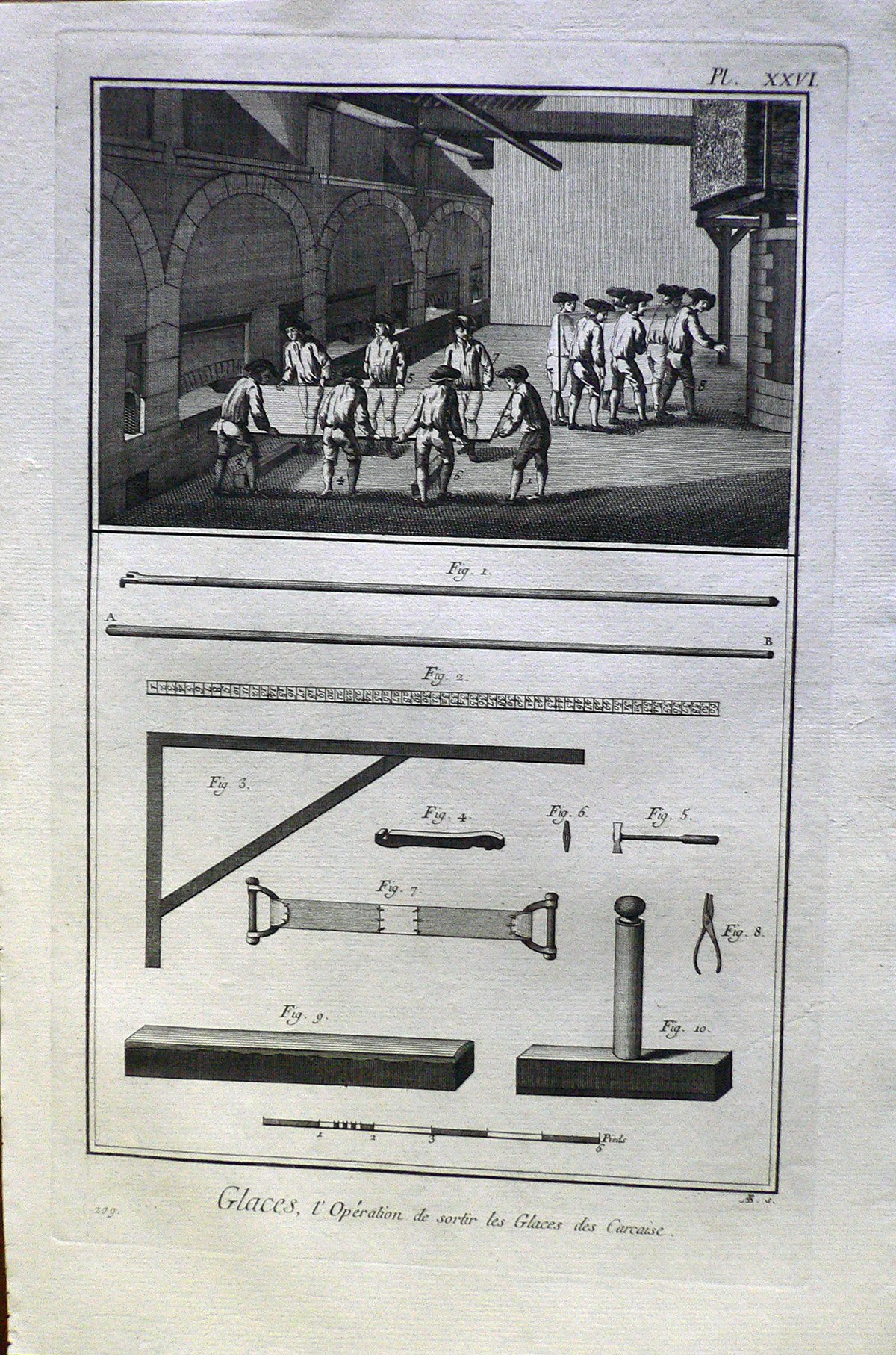La stampa fa parte di una serie di incisioni (345) tratte dall'”Enciclopedia o Dizionario ragionato delle scienze, delle arti e dei mestieri (Encyclopédie ou Dictionnaire raisonné des sciences, des arts et des métiers”). L’enciclopedia fu pubblicata nel XVIII secolo (il primo tomo è del 1751, l’ultimo del 1772), in lingua francese, da un consistente gruppo di intellettuali sotto la direzione di Denis Diderot e con la collaborazione di Jean-Baptiste Le Rond d’Alembert. La sua introduzione, il Discorso Preliminare, è considerata un’importante esposizione degli ideali dell’Illuminismo, nel quale viene esplicitato l’intento dell’opera di incidere profondamente sul modo di pensare e sulla cultura del tempo: “l’opera che iniziamo […] ha due scopi: in quanto enciclopedia, deve esporre quanto più è possibile l’ordine e la connessione delle conoscenze umane; in quanto Dizionario ragionato delle scienze, delle arti e dei mestieri, deve spiegare i principi generali su cui si fonda ogni scienza e arte, liberale o meccanica, e i più notevoli particolari che ne costituiscono il corpo e l’essenza”. Essa costituì il più ponderoso e consapevole compendio – in un certo senso un vero e proprio manifesto – rappresentativo della visione del mondo promossa dal movimento filosofico e culturale passato alla Storia come Illuminismo e finì per incarnare il concetto stesso di enciclopedia come summa complessiva e sistematica delle conoscenze di un’intera cultura, laddove l’impiego di una lingua nazionale si afferma definitivamente come mezzo di descrizione ordinata dell’intero universo del sapere. Le prime ristampe italiane dell’Encyclopédie, in lingua francese, apparvero nella Repubblica di Lucca (tra il 1758 e il 1776) e a Livorno (1770-1778).