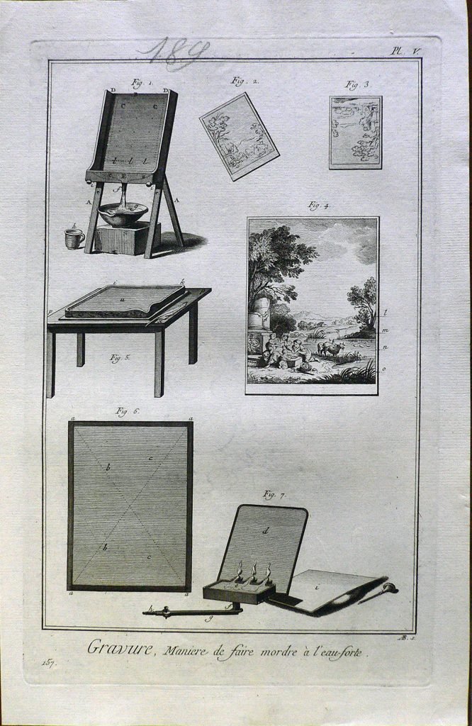 Sono rappresentate due diverse tecniche di morsura, un telaio, esempi di acquaforte; una lampada e un telaio per l’incisione notturna. Ogni figura è connotata da:”fig.”; ogni parte è contraddistinta da lettere. Filigrana: lettere C S. E’ presente numerazione della stampa: Pl.V-157. Sul retro, a matita: 133/12; davanti, a matita: 189.