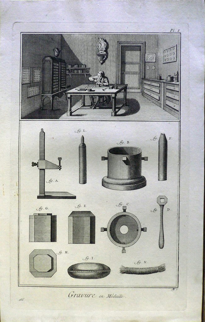 In alto scena d’interno: è rappresentato un laboratorio dove un uomo è intento nell’incisione su medaglia. Sotto gli strumenti necessari al lavoro. Ogni figura è connotata da:”fig.” Filigrana: arco con freccia. E’ presente numerazione della stampa: Pl.I-166. Sul retro, a matita: 212/12