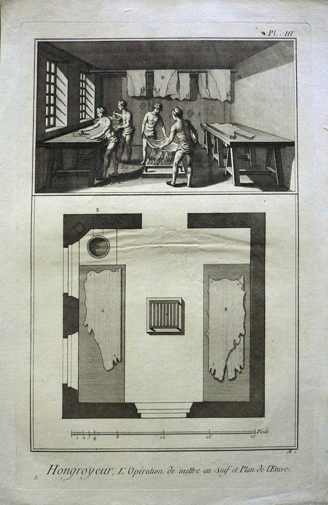 La stampa fa parte di una serie di incisioni (345) tratte dall'”Enciclopedia o Dizionario ragionato delle scienze, delle arti e dei mestieri (Encyclopédie ou Dictionnaire raisonné des sciences, des arts et des métiers”). L’enciclopedia fu pubblicata nel XVIII secolo (il primo tomo è del 1751, l’ultimo del 1772), in lingua francese, da un consistente gruppo di intellettuali sotto la direzione di Denis Diderot e con la collaborazione di Jean-Baptiste Le Rond d’Alembert. La sua introduzione, il Discorso Preliminare, è considerata un’importante esposizione degli ideali dell’Illuminismo, nel quale viene esplicitato l’intento dell’opera di incidere profondamente sul modo di pensare e sulla cultura del tempo: “l’opera che iniziamo […] ha due scopi: in quanto enciclopedia, deve esporre quanto più è possibile l’ordine e la connessione delle conoscenze umane; in quanto Dizionario ragionato delle scienze, delle arti e dei mestieri, deve spiegare i principi generali su cui si fonda ogni scienza e arte, liberale o meccanica, e i più notevoli particolari che ne costituiscono il corpo e l’essenza”. Essa costituì il più ponderoso e consapevole compendio – in un certo senso un vero e proprio manifesto – rappresentativo della visione del mondo promossa dal movimento filosofico e culturale passato alla Storia come Illuminismo e finì per incarnare il concetto stesso di enciclopedia come summa complessiva e sistematica delle conoscenze di un’intera cultura, laddove l’impiego di una lingua nazionale si afferma definitivamente come mezzo di descrizione ordinata dell’intero universo del sapere. Le prime ristampe italiane dell’Encyclopédie, in lingua francese, apparvero nella Repubblica di Lucca (tra il 1758 e il 1776) e a Livorno (1770-1778).