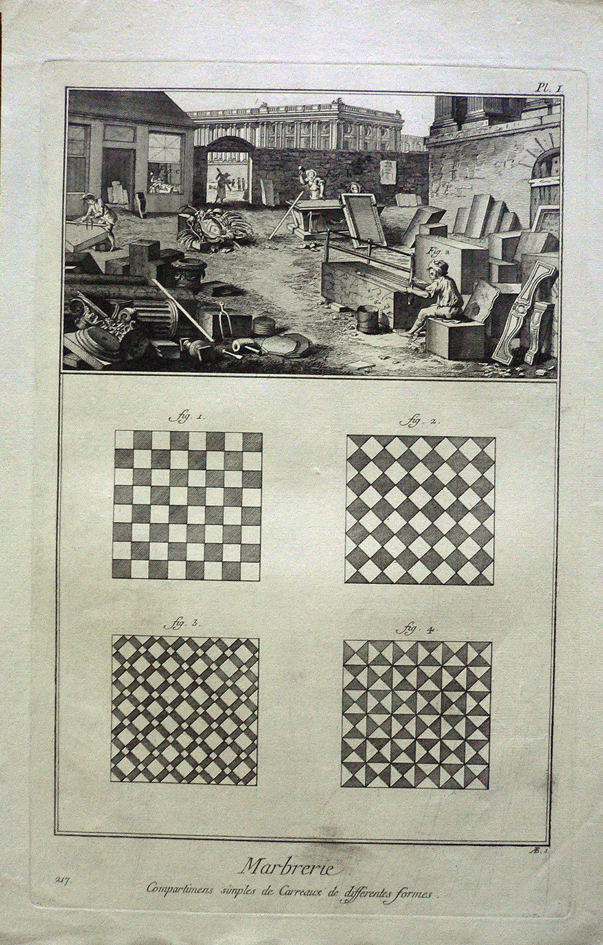In alto sono rappresentati degli uomini in un cortile, mentre lavorano lastre di marmo. Sotto quattro esempi di disegni geometrici sulla lastra. Ogni figura è connotata da:”fig”. E’ presente numerazione della stampa: Pl.I.-217. Sul retro, a matita: 203/12