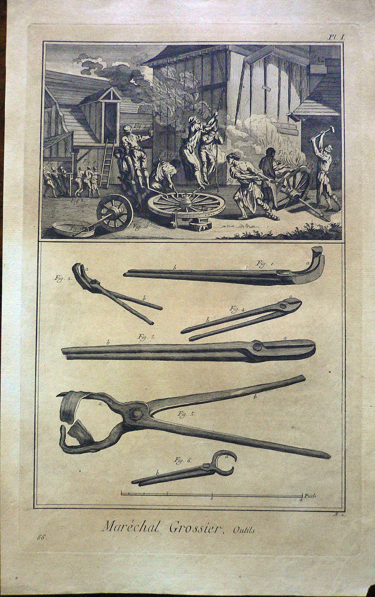 In alto sono rappresentati dei maniscalchi in un cortile mentre lavorano attorno a delle ruote. Sotto alcuni arnesi ( diverse tipologie di pinze ). Ogni figura è connotata da:”fig”, ogni parte è indicata da lettere. Filigrana: BEINETTE. E’ presente numerazione della stampa: Pl.I.-66. Sul retro, a matita: 205/12 e 15 (cerchiato); timbro Collezione Piero Malossi.