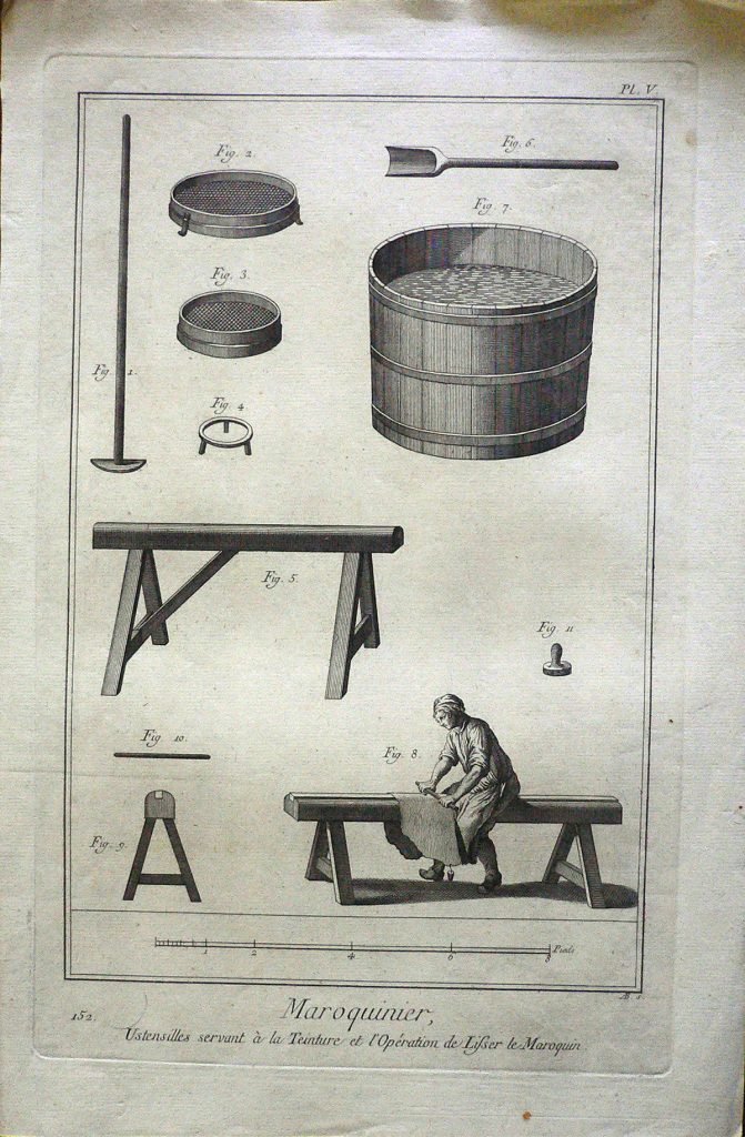 Sono rappresentati gli attrezzi per la tintura delle pelli e la tecnica usata nella lisciatura. Ogni figura è connotata da:”fig”. Filigrana: BEINETE. E’ presente numerazione della stampa: Pl.V.-152. e scala metrica.