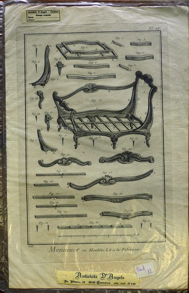 E’ rappresentata la struttura del letto alla “polacca” e le parti che la compongono. Ogni figura è connotata da:”fig.” e ogni parte da lettere. Filigrana: BEINETE. E’ presente numerazione della stampa: Pl.XV.-205. e scala metrica. I bordi sono colorati in rosso; la stampa è contenuta in una busta trasparente sigillata e classificata:”Card 12″