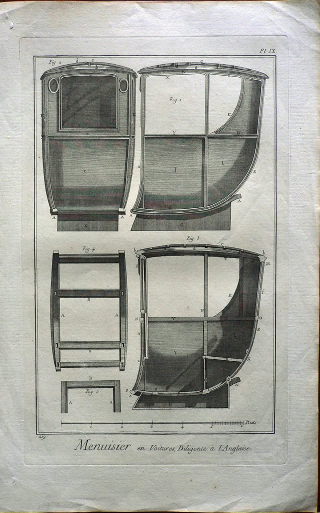 La carrozza “diligenza all’inglese” è rappresentata in diverse viste: due sezioni laterali, un prospetto frontale, oltre ad alcuni dettagli che la compongono. Ogni figura è connotata da:”fig.”, ogni parte da lettere. Filigrana: BEINETTE. E’ presente numerazione della stampa: Pl.IX.-219 e scala metrica. I bordi sono colorati in rosso.