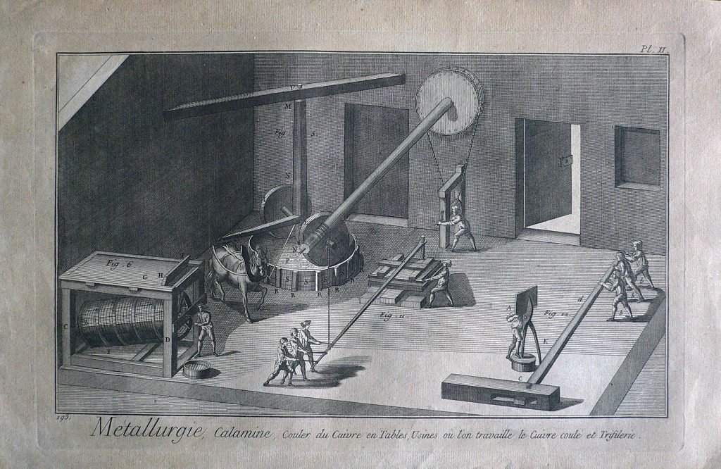 Sono rappresentate varie fasi della lavorazione del rame: degli uomini e un cavallo muovono delle ruote, mentre altri, attraverso l’uso di una leva azionano una pinza. Ogni figura è connotata da:”fig.”; ogni parte da lettere. Filigrana: sole. E’ presente numerazione della stampa: Pl.II.-193. In basso a destra, in matita: 224/12; timbro Collezione; in matita:8 (cerchiato)