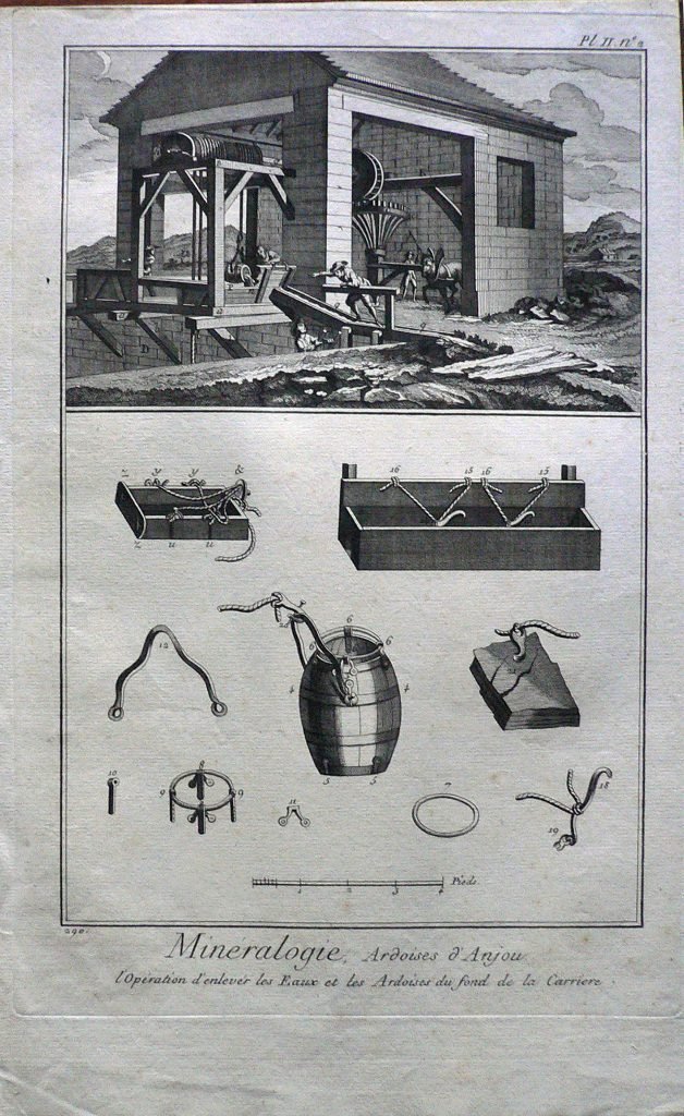Nel primo riquadro è rappresentata una struttura per portare in superfice l’acqua e l’ardesia: attraverso l’uso di cavallo viene mossa una ruota su cui è arrotolata la fune. Sotto alcuni attrezzi. Ogni figura è connotata da:”fig.”; ogni parte da lettere e numero. Filigrana: sole. E’ presente numerazione della stampa: Pl. II. N°2.-290. In basso a destra, in matita: 237/12. e scala metrica.