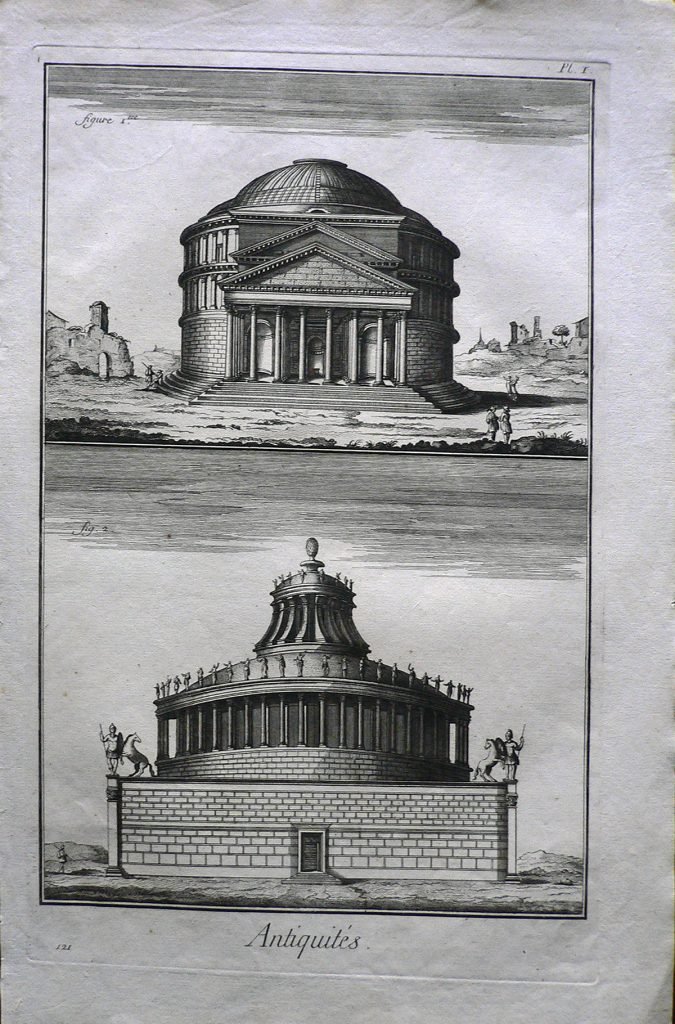 Rappresentazione del Pantheon con altri edifici sullo sfondo e tre copie di personaggi. In basso altro edificio circolare su zoccolo decorato con statue. Ogni figura è connotata da :”fig.”. E’ presente numerazione della stampa: Pl. I.-112. Filigrana: elisse con all’interno lettere. Sul retro, in matita: timbro Piero Malossi; in alto a mat.189/12; cerchio