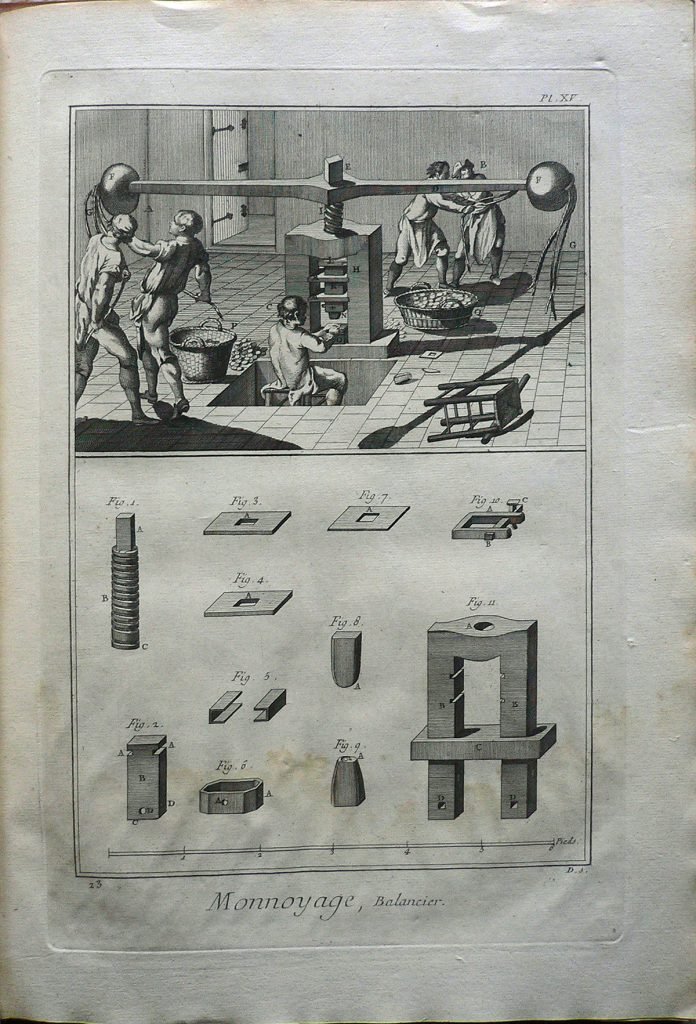 Nel primo riquadro scena d’interno: è rappresentato il macchinario che conia le monete. Sotto le parti che lo compongono. Ogni figura è connotata da:”fig.”;ogni parte da lettere. Filigrana: sole. E’ presente numerazione della stampa: Pl.XV.-23 e scala metrica. In alto a sinistra: 189/12