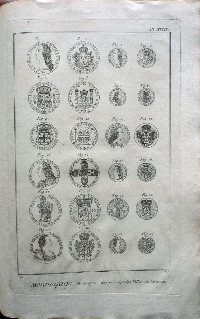 Sono rappresentate vari tipopogie di monete delle principali città d’Europa. Ogni figura è connotata da:”fig.”. Filigrana: sole. E’ presente numerazione della stampa: Pl.XVIII.-26. La stampa è rilegata e raccolta attraverso una fascia di cartoncino bianco incollato lungo il lato sinistro; timbro Collezione Piero Malossi.