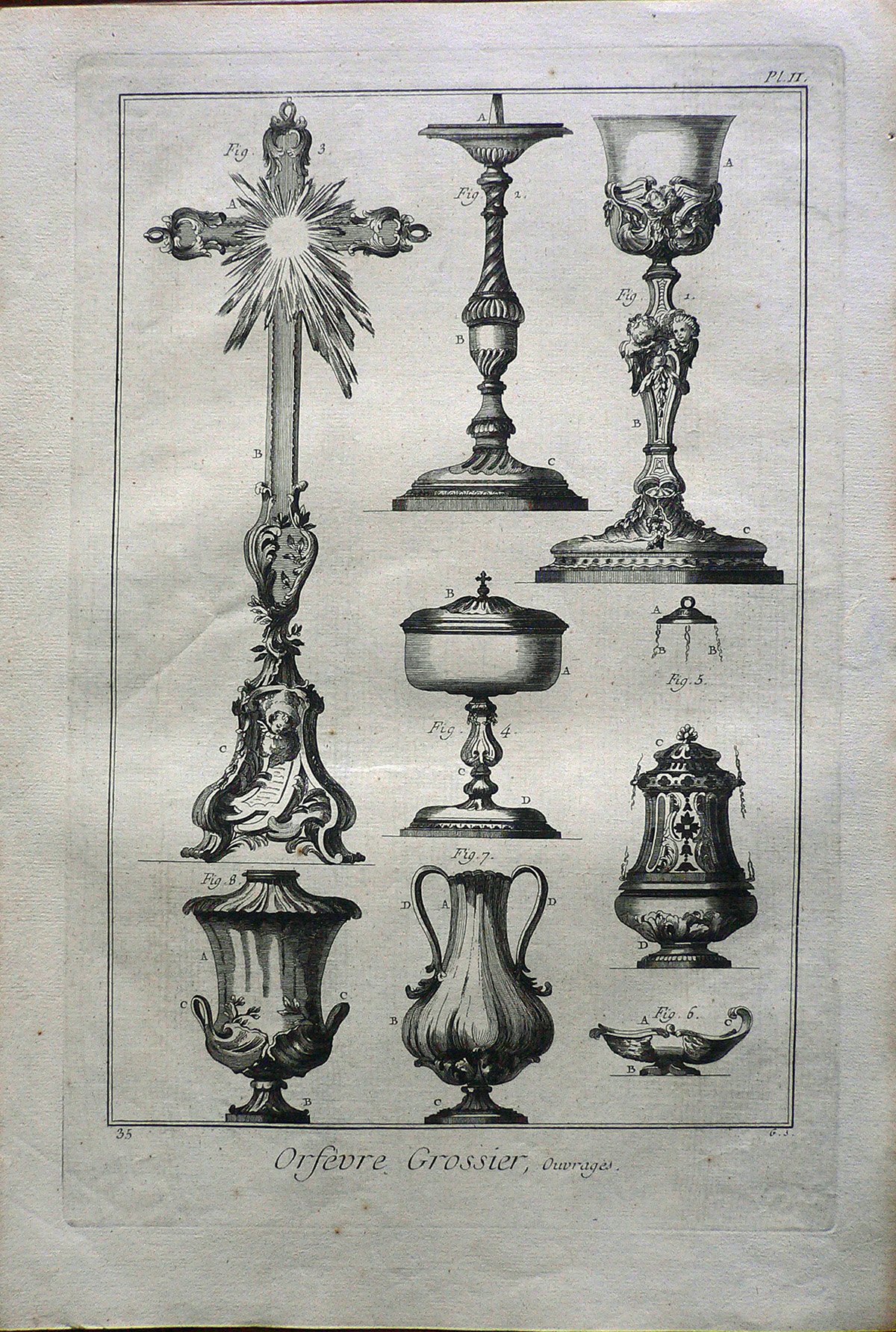 Sono rappresentati vari oggetti d’oreficeria: ostensorio, candeliere, calice, ciborio, incensiere, vasi d’altare e navicella. Ogni figura è connotata da:”fig.”. Ogni parte indicata da lettere. Filigrana: sole. E’ presente numerazione della stampa: Pl.II.-35. In alto a sinistra numero in matita: 6/12.