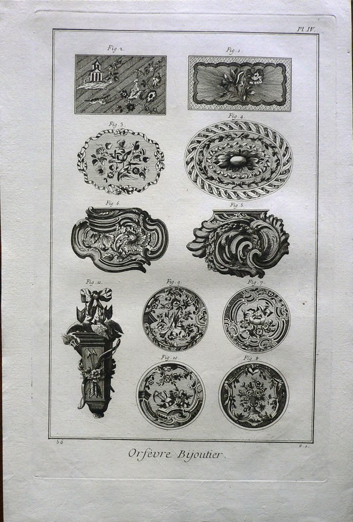 Sono rappresentati vari oggetti d’oreficieria: coperchi e ornamenti per scatole. Ogni figura è connotata da:”fig.”. Filigrana: P S. E’ presente numerazione della stampa: Pl.IV.-56. In alto, a sinistra, in matita: 34/12; timbro Collezione Piero Malossi.