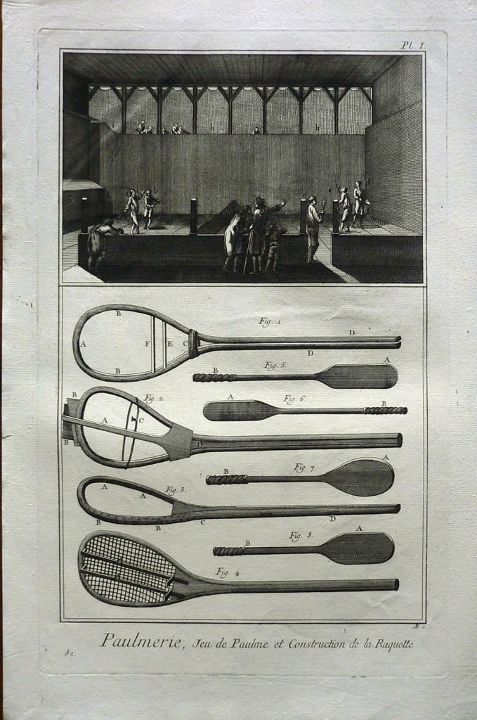 Nel primo riquadro scena d’interno: degli uomini giocano a palla con una racchetta in un campo diviso da una rete, mentre altri osservano. Sotto le fasi di costruzione della racchetta. Ogni figura è connotata da:”fig.”; ogni parte da lettere. Filigrana: P S. E’ presente numerazione della stampa: Pl.I.-82. In alto, a sinistra, in matita: 176/12.
