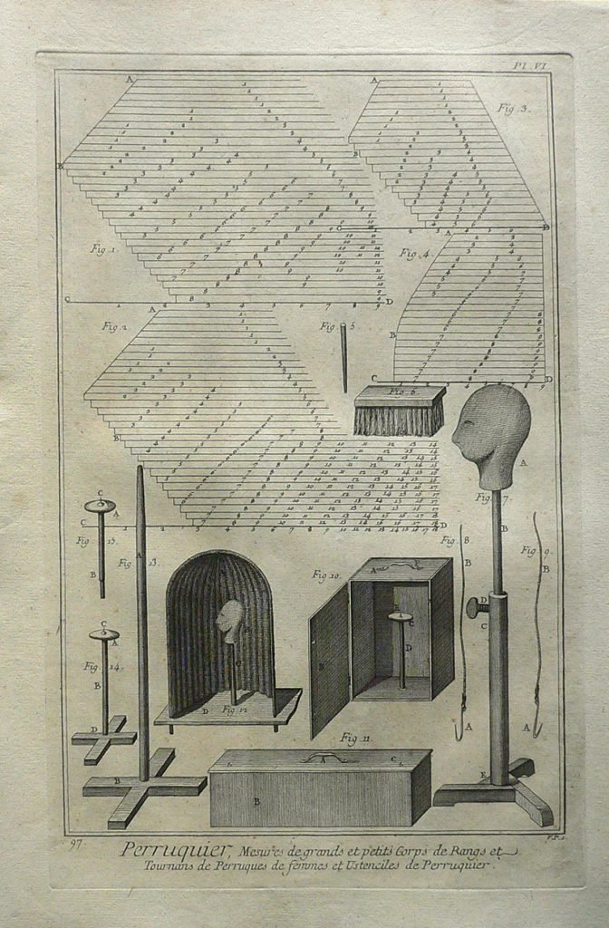 Sono rappresentate le scale di misura, gli strumenti utilizzati e gli appoggi girevoli per la realizzazione delle parrucche da signora. Ogni figura è connotata da:”fig.”; ogni parte da lettere. E’ presente numerazione della stampa: Pl.VI.-97. Filigrana: sole. In alto, a sinistra, in matita: 341/12; timbro Collezione Piero Malossi; in matita 15 (cerchiato).