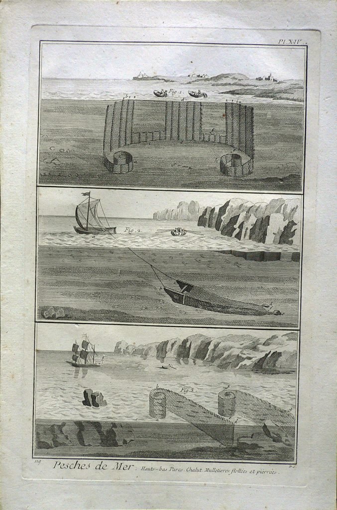 Nel primo riquadro sono rappresentate delle riserve, nel secondo la rete detta “sciabica”, nel terzo una chiassaiuola. Ogni figura è connotata da:”fig.”; ogni parte da lettere. Filigrana: BEINETE. E’ presente numerazione della stampa: Pl.XIV.-119. In alto, a sinistra, in matita: 22/12; timbro Collezione Piero Malossi; in matita 7 (cerchiato).