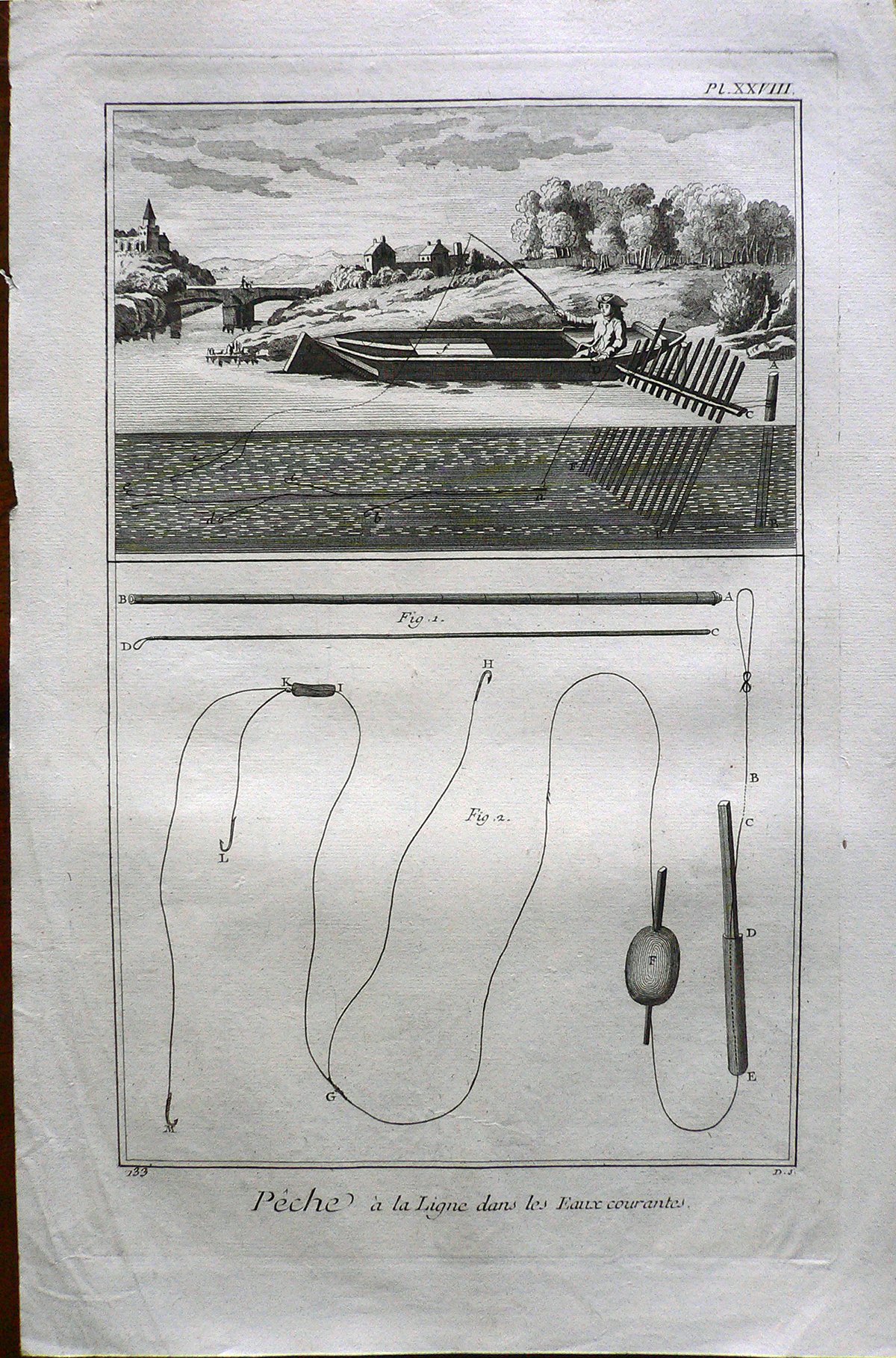 Nel riquadro superiore è rappresentato un pescatore mentre pesca con una lenza volante, una lenza di fondo e una cannicciata. Sotto la lenza e la canna in due pezzi. Ogni figura è connotata da:”fig.”, ogni parte è indicata da lettere. Filigrana: P S. E’ presente numerazione della stampa: Pl.XXVIII.-133. In alto, a sinistra, in matita: 169/12; un timbro Collezione Piero Malossi.