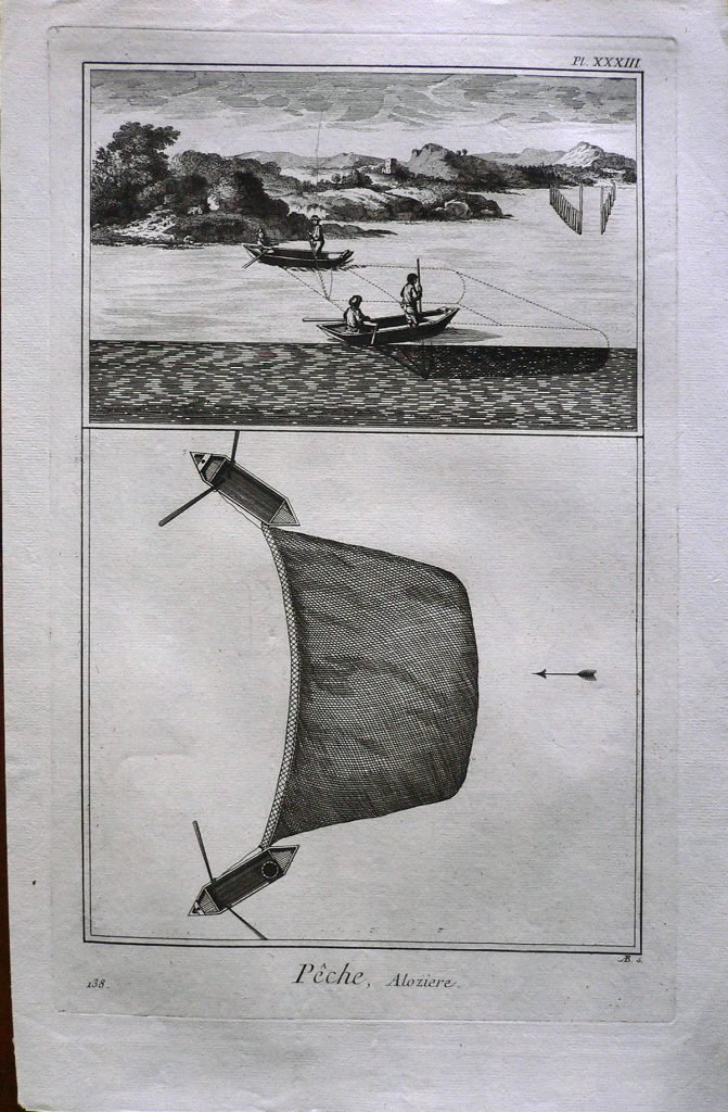 E’ rappresentata la pesca in un fiume con la rete: la barca viene disposta di traverso rispetto alla corrente e la rete gettata a monte. Ogni figura è connotata da:”fig.”, ogni parte è indicata da lettere. Filigrana: P S. E’ presente numerazione della stampa: Pl.XXXIII.-138. In alto, a sinistra, in matita: 162/12; un timbro Collezione Piero Malossi.