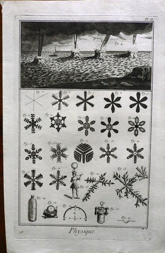 Nel primo riquadro sono rappresentati diversi effetti delle precipitazioni. Sotto le forme dei cristalli di ghiaccio e alcuni strumenti. Ogni figura è connotata da: “fig.”; ogni parte è indicata da lettere. Filigrana: tre lune. E’ presente numerazione della stampa: Pl.II.-96. In alto, a sinistra, in matita: 336/12; timbro Piero Malossi; cerchio in matita.