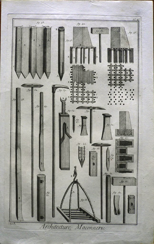 La stampa fa parte di una serie di incisioni (345) tratte dall'”Enciclopedia o Dizionario ragionato delle scienze, delle arti e dei mestieri (Encyclopédie ou Dictionnaire raisonné des sciences, des arts et des métiers”). L’enciclopedia fu pubblicata nel XVIII secolo (il primo tomo è del 1751, l’ultimo del 1772), in lingua francese, da un consistente gruppo di intellettuali sotto la direzione di Denis Diderot e con la collaborazione di Jean-Baptiste Le Rond d’Alembert. La sua introduzione, il Discorso Preliminare, è considerata un’importante esposizione degli ideali dell’Illuminismo, nel quale viene esplicitato l’intento dell’opera di incidere profondamente sul modo di pensare e sulla cultura del tempo: “l’opera che iniziamo […] ha due scopi: in quanto enciclopedia, deve esporre quanto più è possibile l’ordine e la connessione delle conoscenze umane; in quanto Dizionario ragionato delle scienze, delle arti e dei mestieri, deve spiegare i principi generali su cui si fonda ogni scienza e arte, liberale o meccanica, e i più notevoli particolari che ne costituiscono il corpo e l’essenza”. Essa costituì il più ponderoso e consapevole compendio – in un certo senso un vero e proprio manifesto – rappresentativo della visione del mondo promossa dal movimento filosofico e culturale passato alla Storia come Illuminismo e finì per incarnare il concetto stesso di enciclopedia come summa complessiva e sistematica delle conoscenze di un’intera cultura, laddove l’impiego di una lingua nazionale si afferma definitivamente come mezzo di descrizione ordinata dell’intero universo del sapere. Le prime ristampe italiane dell’Encyclopédie, in lingua francese, apparvero nella Repubblica di Lucca (tra il 1758 e il 1776) e a Livorno (1770-1778).