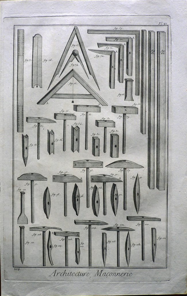 Nella parte superiore sono rappresentati strumenti di misura. In basso martelli con le relative teste. Ogni parte è indicata con lettere, ogni figura è connotata da :”fig.” E’ presente numerazione della stampa: Pl.XI.-204. Sul retro, a matita: 127/12